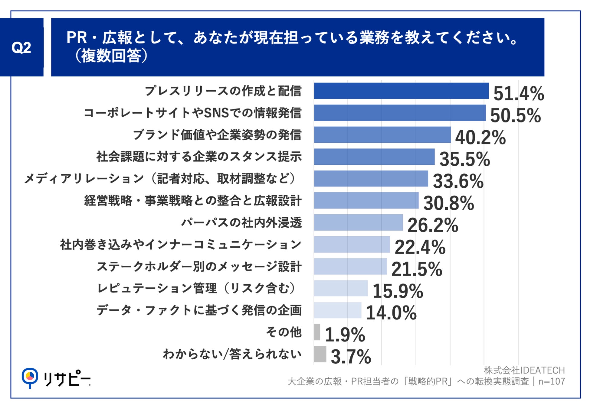 「Q2.PR・広報として、あなたが現在担っている業務を教えてください。(複数回答)」(n=107)と質問したところ、「プレスリリースの作成と配信」が51.4%、「コーポレートサイトやSNSでの情報発信」が50.5%、「ブランド価値や企業姿勢の発信」が40.2%という回答となりました。