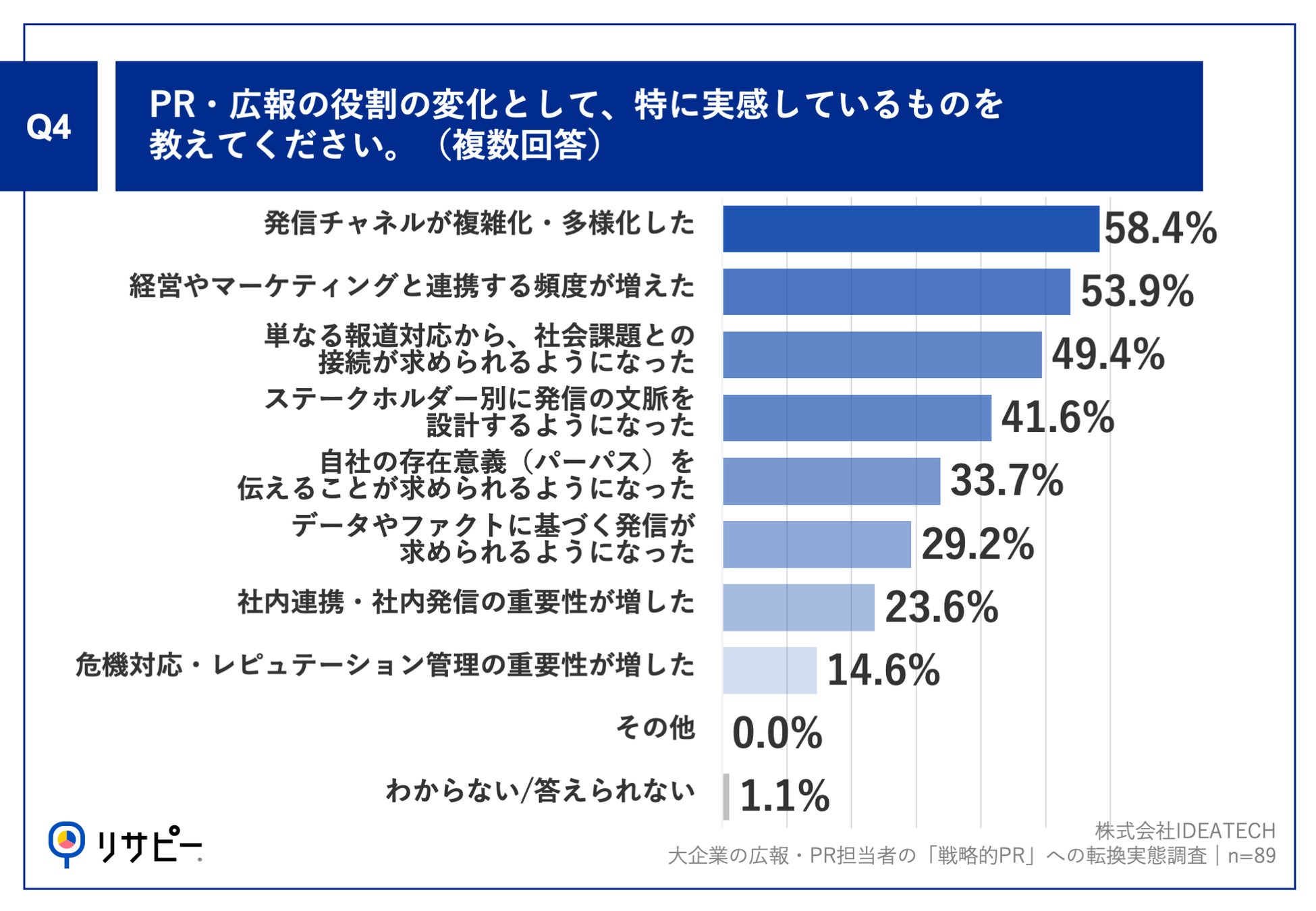 「Q4.Q3で「大きく変化している」「ある程度変化している」と回答した方にお聞きします。PR・広報の役割の変化として、特に実感しているものを教えてください。(複数回答)」(n=89)と質問したところ、「発信チャネルが複雑化・多様化した」が58.4%、「経営やマーケティングと連携する頻度が増えた」が53.9%、「単なる報道対応から、社会課題との接続が求められるようになった」が49.4%という回答となりました。