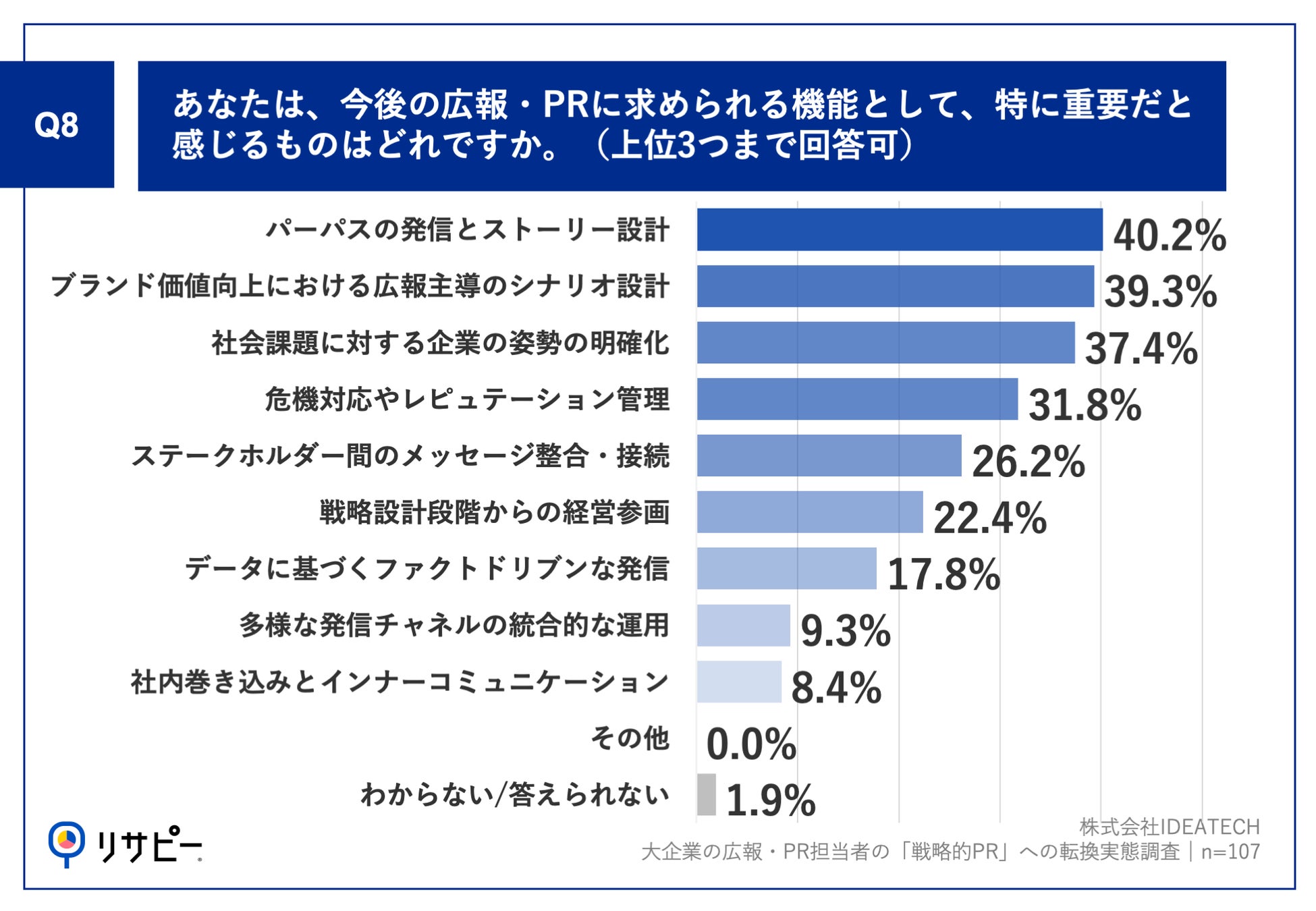 「Q8.あなたは、今後の広報・PRに求められる機能として、特に重要だと感じるものはどれですか。(上位3つまで回答可)」(n=107)と質問したところ、「パーパスの発信とストーリー設計」が40.2%、「ブランド価値向上における広報主導のシナリオ設計」が39.3%、「社会課題に対する企業の姿勢の明確化」が37.4%という回答となりました。