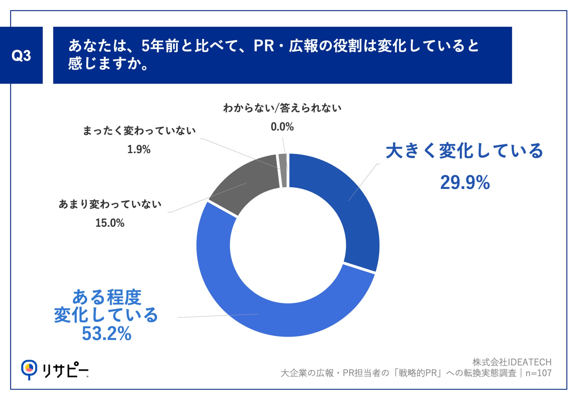 「Q3.あなたは、5年前と比べて、PR・広報の役割は変化していると感じますか。」(n=107)と質問したところ、「大きく変化している」が29.9%、「ある程度変化している」が53.3%という回答となりました。