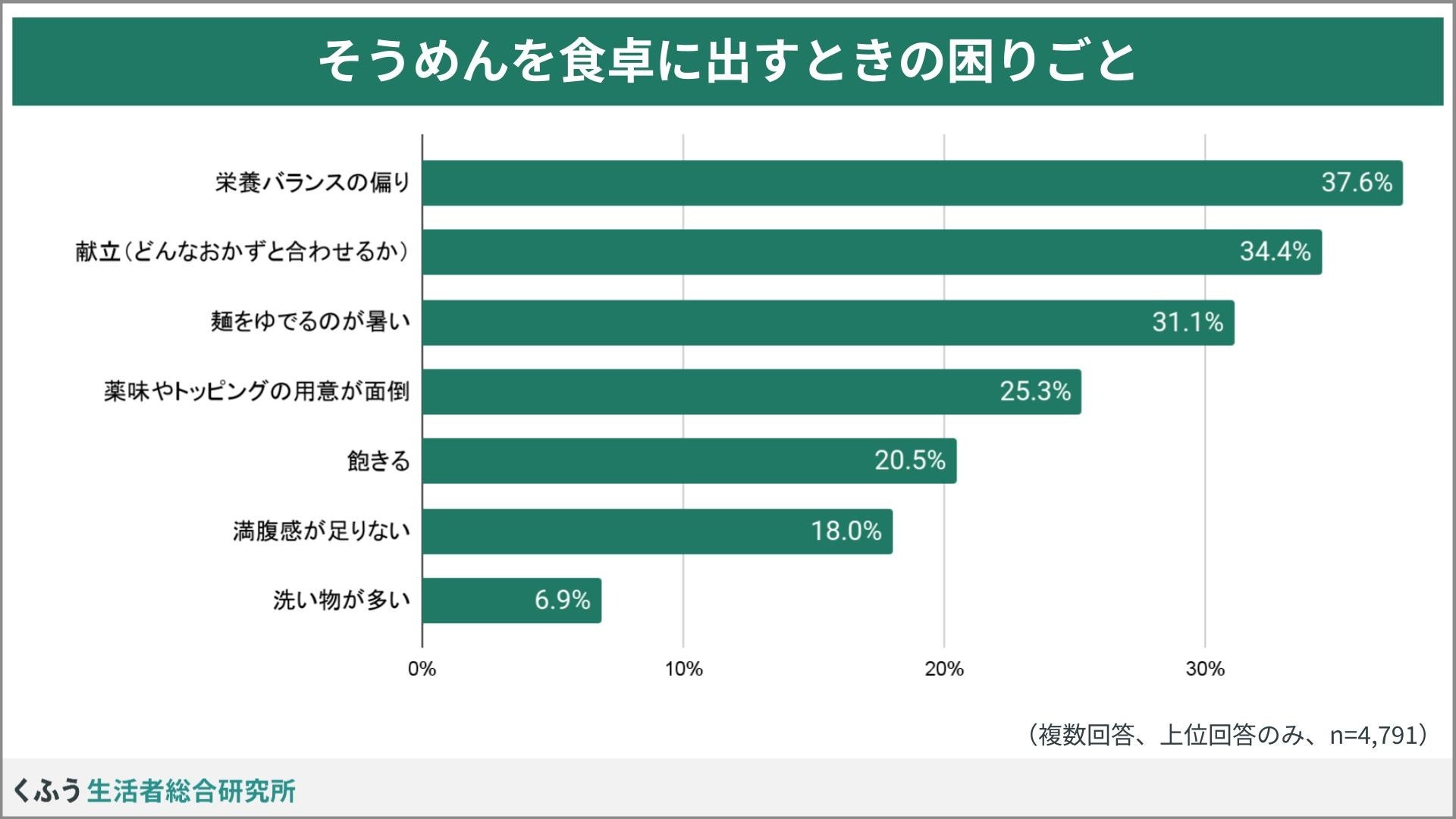 そうめんを食卓に出すときに困ることがあるかをたずねたところ、「栄養バランスの偏り」(37.6%)、「献立(どんなおかずと合わせるか)」(34.4%)が上位に挙がり、そうめんだけを食事にすることに難しさを感じていることがわかります。他には、「麺をゆでるのが暑い」(31.1%)、「薬味やトッピングの用意が面倒」(25.3%)、「洗い物が多い」(6.9%)など、猛暑下のキッチンでの作業負担につながる理由が挙がりました。