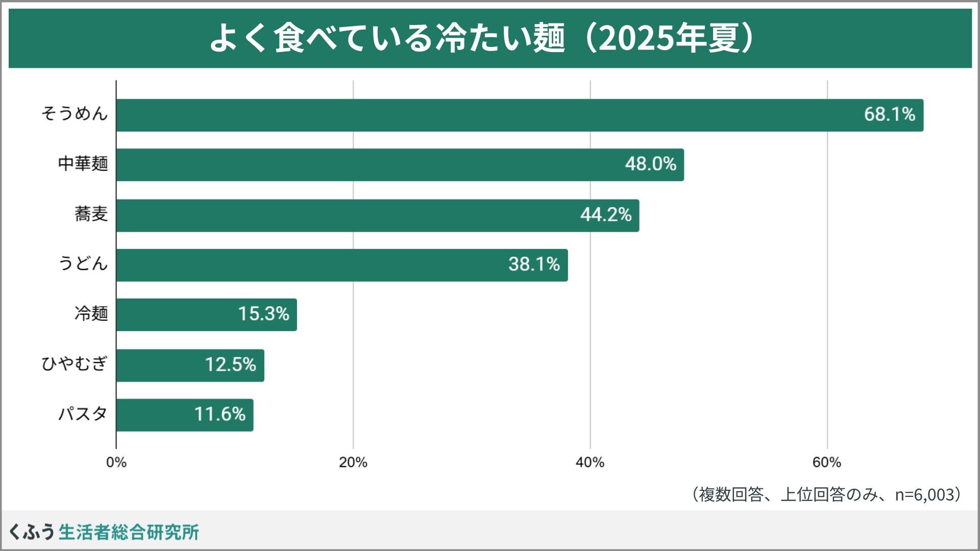 この夏、よく食べている冷たい麺をたずねたところ、「そうめん」(68.1%)が最も多い結果となりました。上位には、冷やし中華、冷やしラーメンなど「中華麺」(48.0%)、「蕎麦」(44.2%)、「うどん」(38.1%)が続きました。