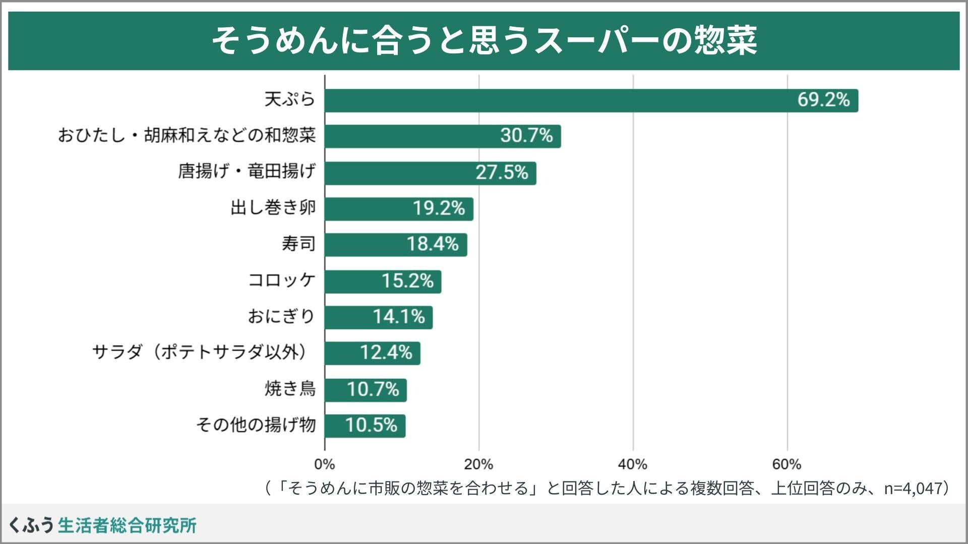 そうめんに合うスーパーの惣菜としては、「天ぷら」(69.2%)と回答した人が圧倒的に多い結果となりました。「そうめんには天ぷらが合うと思うが揚げるのが面倒・暑い」という声が多く、市販の惣菜を活用している人が多い模様です。