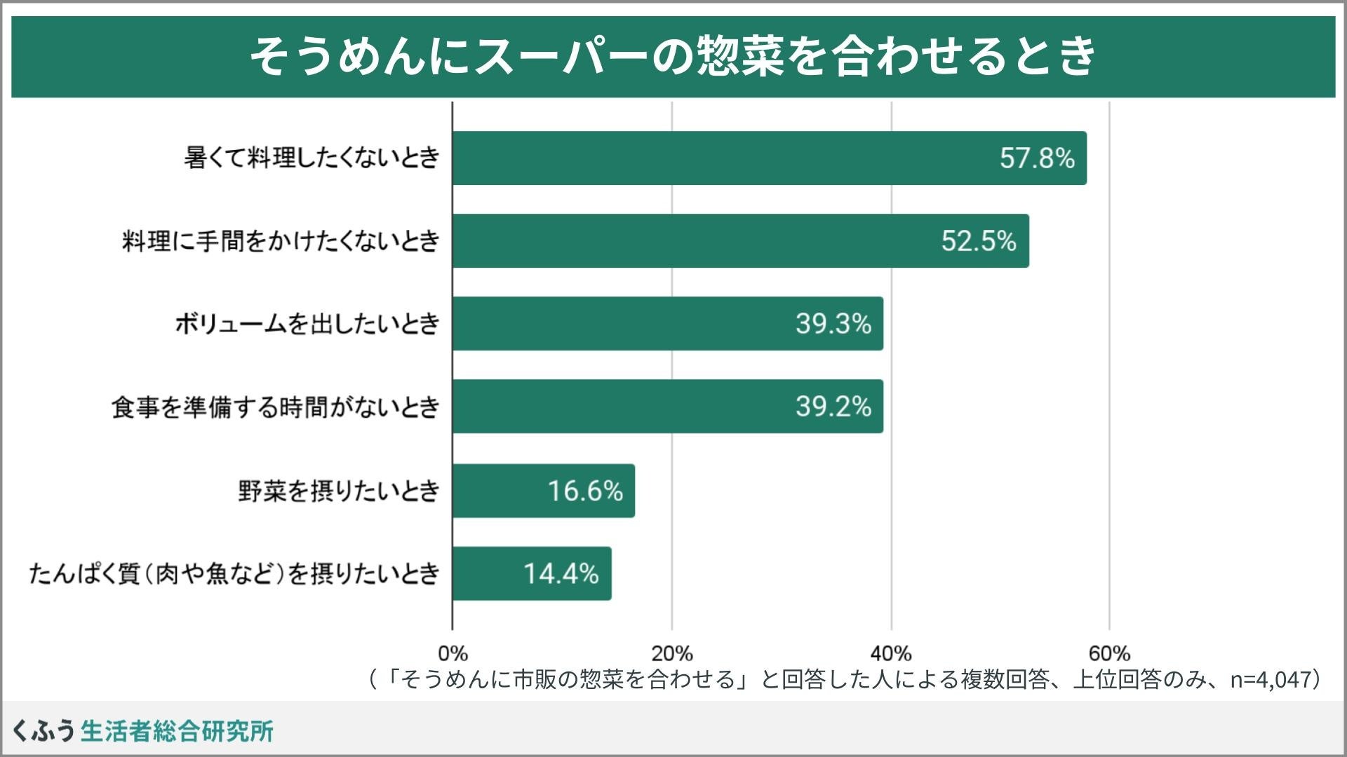 実際、そうめんに合わせるおかずにスーパーの惣菜を重宝するのは「暑くて料理したくないとき」(57.8%)、「料理に手間をかけたくないとき」(52.5%)と半数以上の人が回答しました。