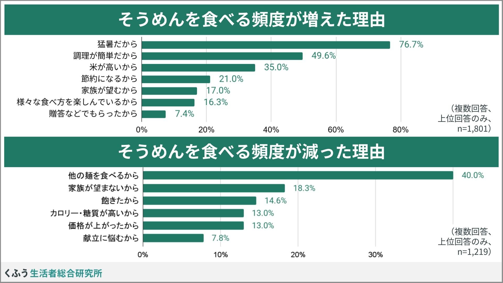 ここ数年と比べて今年「そうめんを食べる頻度が増えた」と回答した人の理由は、「猛暑だから」(76.7%)が圧倒的に多く、「調理が簡単だから」(49.6%)が続きました。また、米の価格高騰の影響により、「米が高いから」(35.0%)と、米の代用として食卓に上がる頻度が高くなった家庭もあるようです。