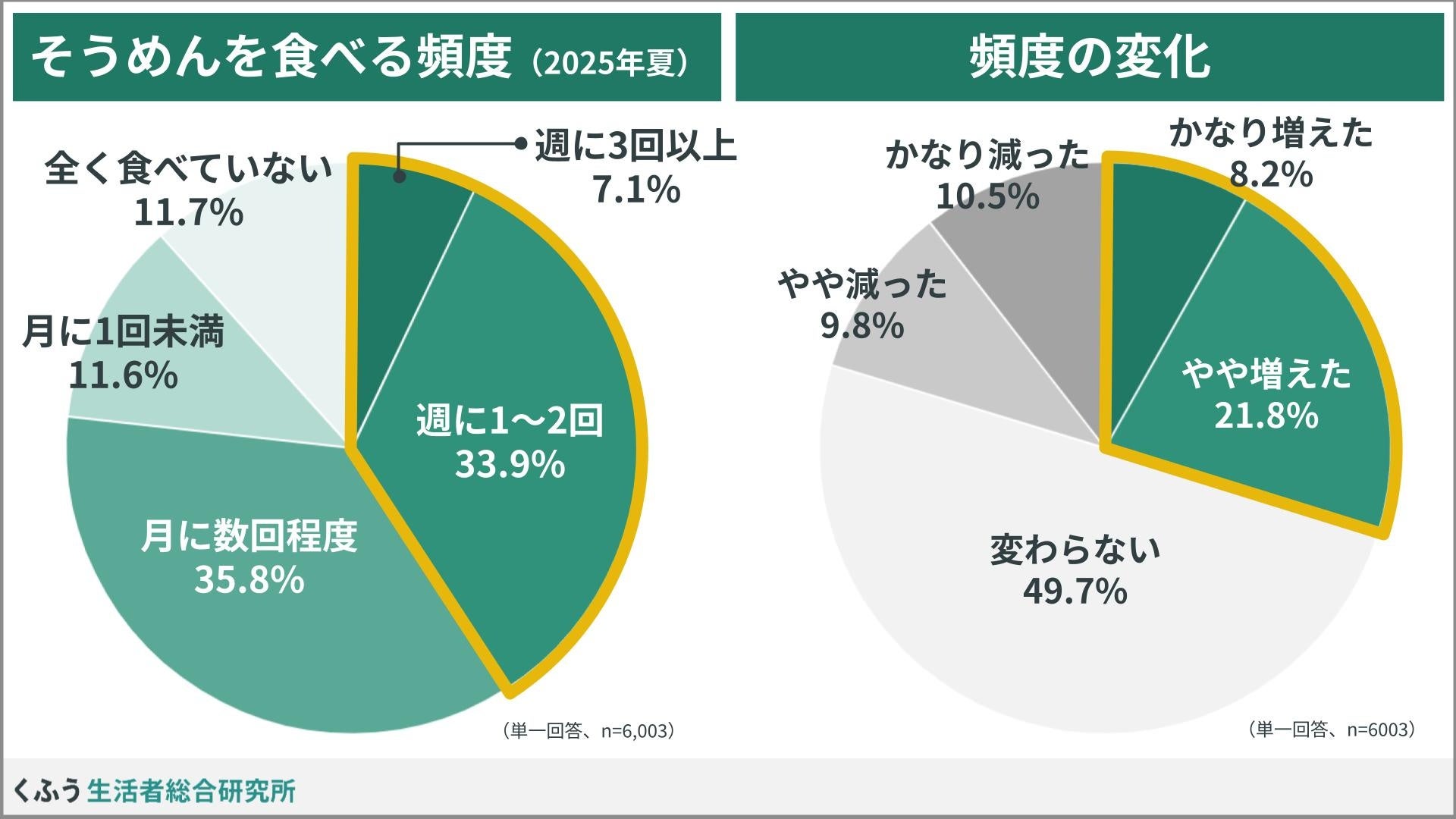 約7割が"よく食べている冷たい麺"として挙げた「そうめん」は、週に1回以上食べている人が約4割。食べる頻度については、3割の人がここ数年と比べて今年「増えた」(「かなり増えた」と「やや増えた」の合計)と回答しました。