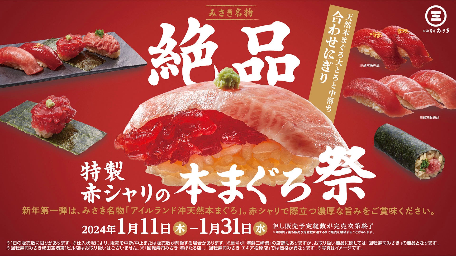 「回転寿司みさき」の新年第一弾フェアは、みさき名物“アイルランド沖天然本まぐろ”を厳選した『絶品 特製赤シャリの本まぐろ祭』です。アイルランド沖で獲れた天然本まぐろは、北大西洋の冷たく荒れた海流で育ち、身が締まった上に脂のりが抜群で、まぐろの中でも最高峰とも謳われています。今回のフェアでは、“アイルランド沖天然本まぐろ”の様々な部位をお楽しみいただけるような新たな商品をご用意いたします。