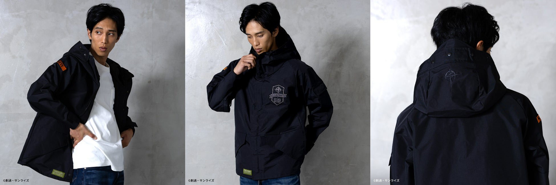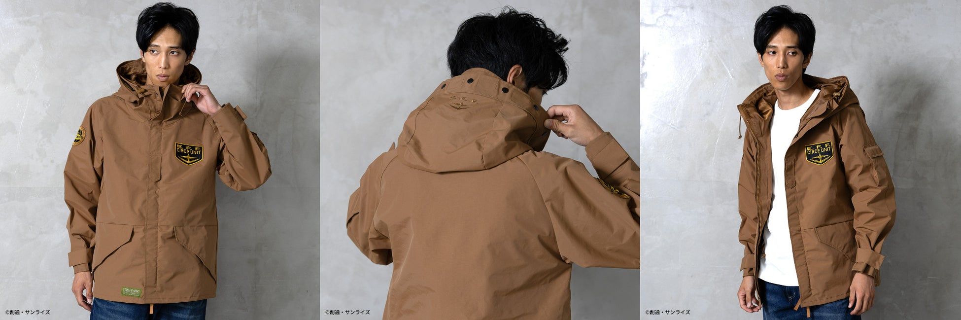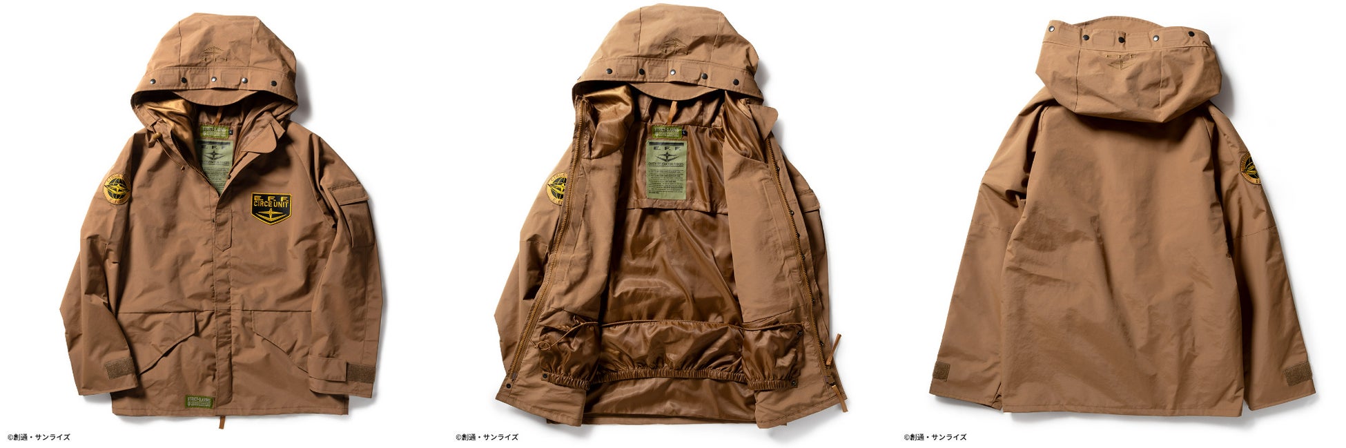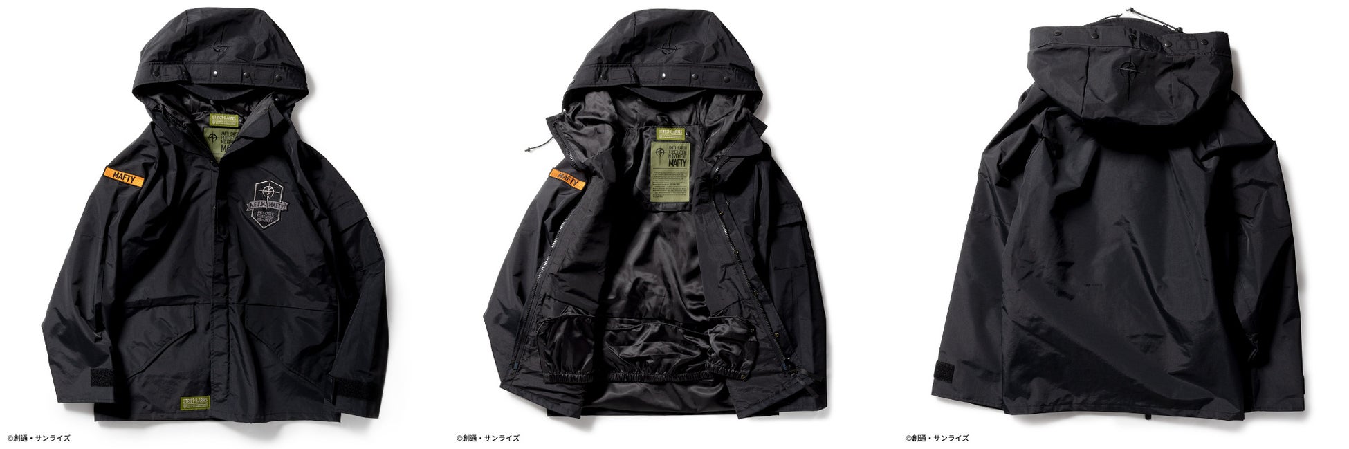 さらに、左胸、右袖の刺繍ワッペン、フード部分の刺繍でガンダムの世界観を表現。ブラックカラーに際し色のオレンジが効いたMAFTYモデル、コヨーテカラーにイエロー系の差し色が効いたE.F.F.モデルの2種展開致します。普段使いはもちろんのこと、アウトドアユースにも最適なアイテムです。