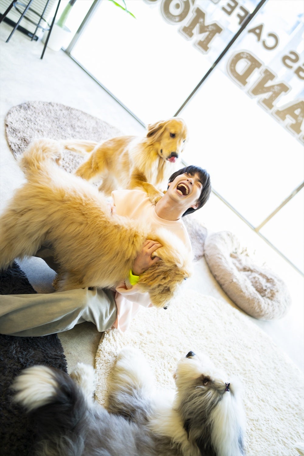 ドッグカフェ編では、大の犬好きである青木本人の希望でドッグカフェを再訪。連載時とは別の大型犬専門ドッグカフェで大きな犬たちと遊ぶ青木のあたたかな表情が満載です。