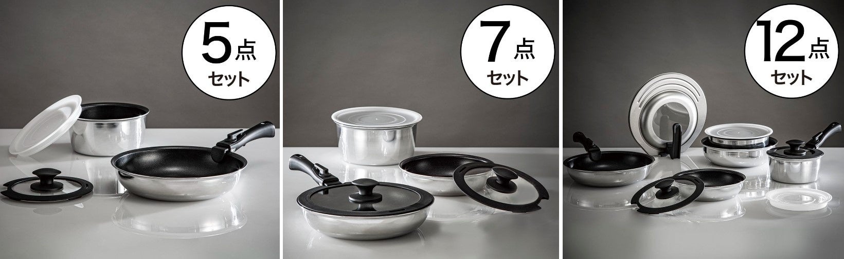 セット品のラインアップは、5点・7点・12点。それぞれ単品でご購入いただくより、お得に揃えていただけます。最もお求めやすい価格のもの、最も軽くてガス火専用のもの、ガス・IHどちらもつかえる超軽量の3種類をご用意しています。