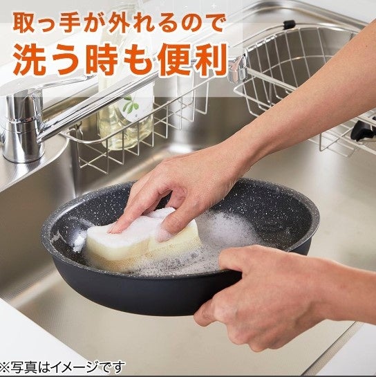 ②お皿のようにマルっと洗えるので、狭いシンクでも洗いやすく便利。また、マーブルコーティング仕様でこびりつきにくいです。