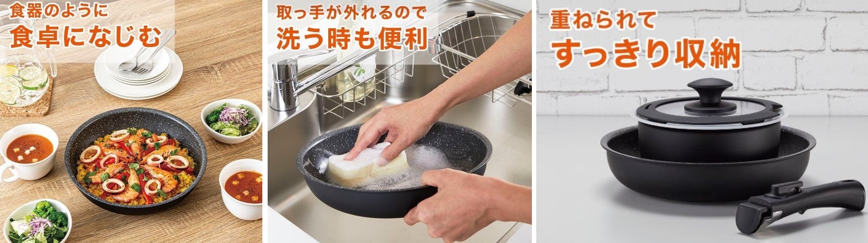 取っ手が取れる鍋・フライパン「TORERU2」シリーズは、取っ手がとれるので洗いやすくて収納もしやすく、お皿の代わりにもなる便利な人気のアイテム。いろんな種類を取り扱っており、TORERU2シリーズ累計販売数は約66万個です。