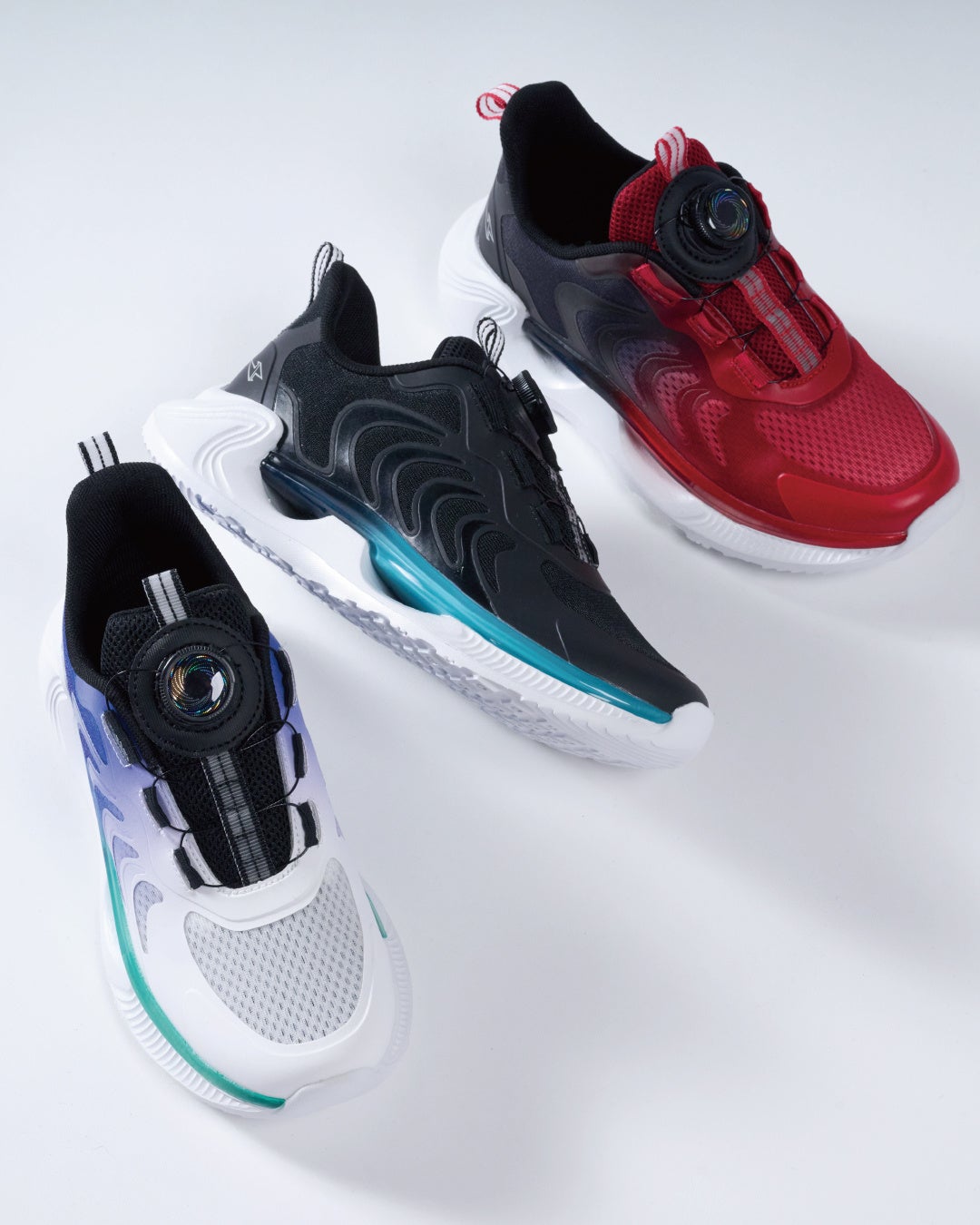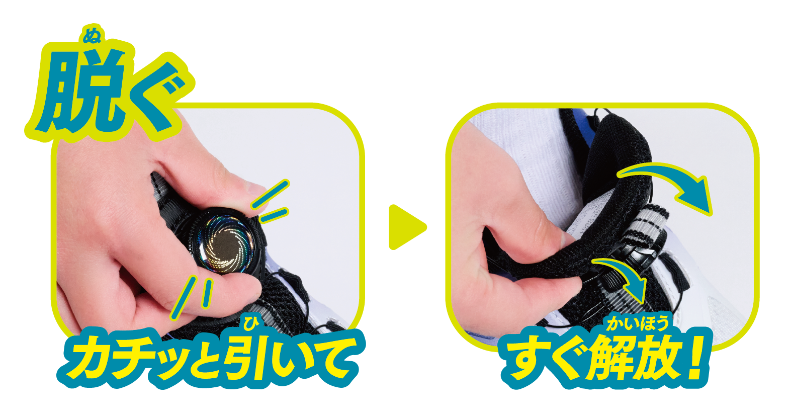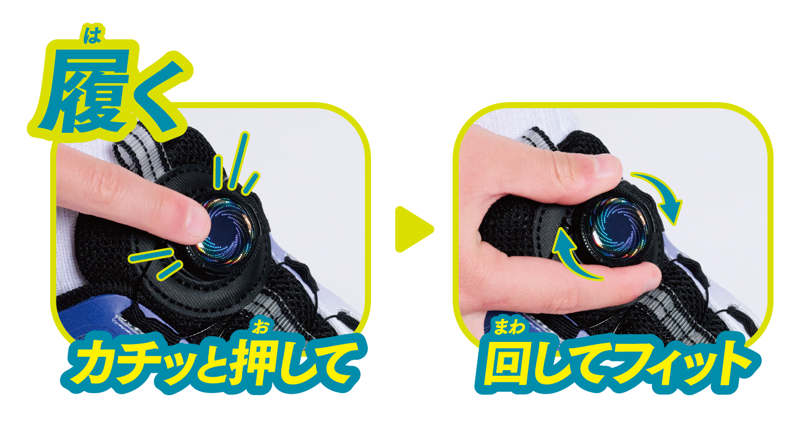すべてのモデルに搭載された「ダイヤルシステム」は、トップのダイヤルを回すだけでフィット感の調整ができ、脱ぎ履きも簡単。お子さま一人でも素早く着脱が可能です。