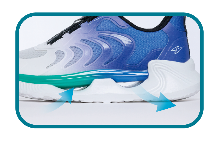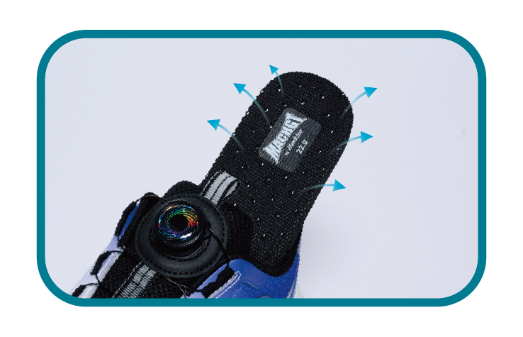 特に注目したいのが、インソールとミッドソールに通気口を備えた「ダイヤルクール」。子どもは大人よりも体温が高く、地面からの熱の影響を受けやすいため、夏場は熱がこもりやすく、熱中症リスクも高いと言われています。そんな猛暑の季節でも、360°の通気設計で足元の熱を効率よく逃がし、猛暑の夏も快適に過ごせる一足です。