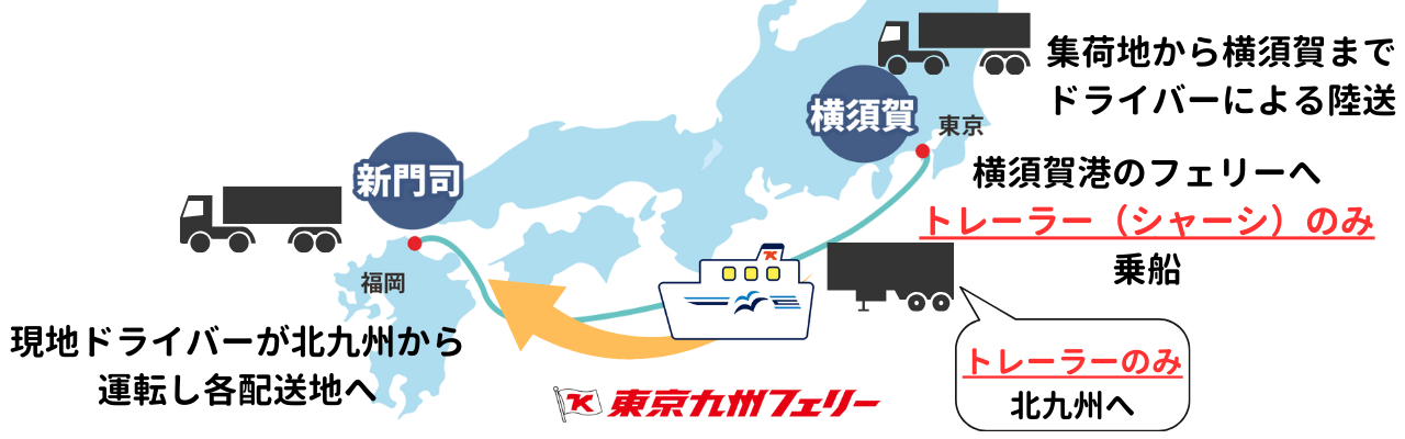 従来まではトラックによる陸送だったところ、横須賀発新門司行のフェリー(海上輸送)の活用を開始。