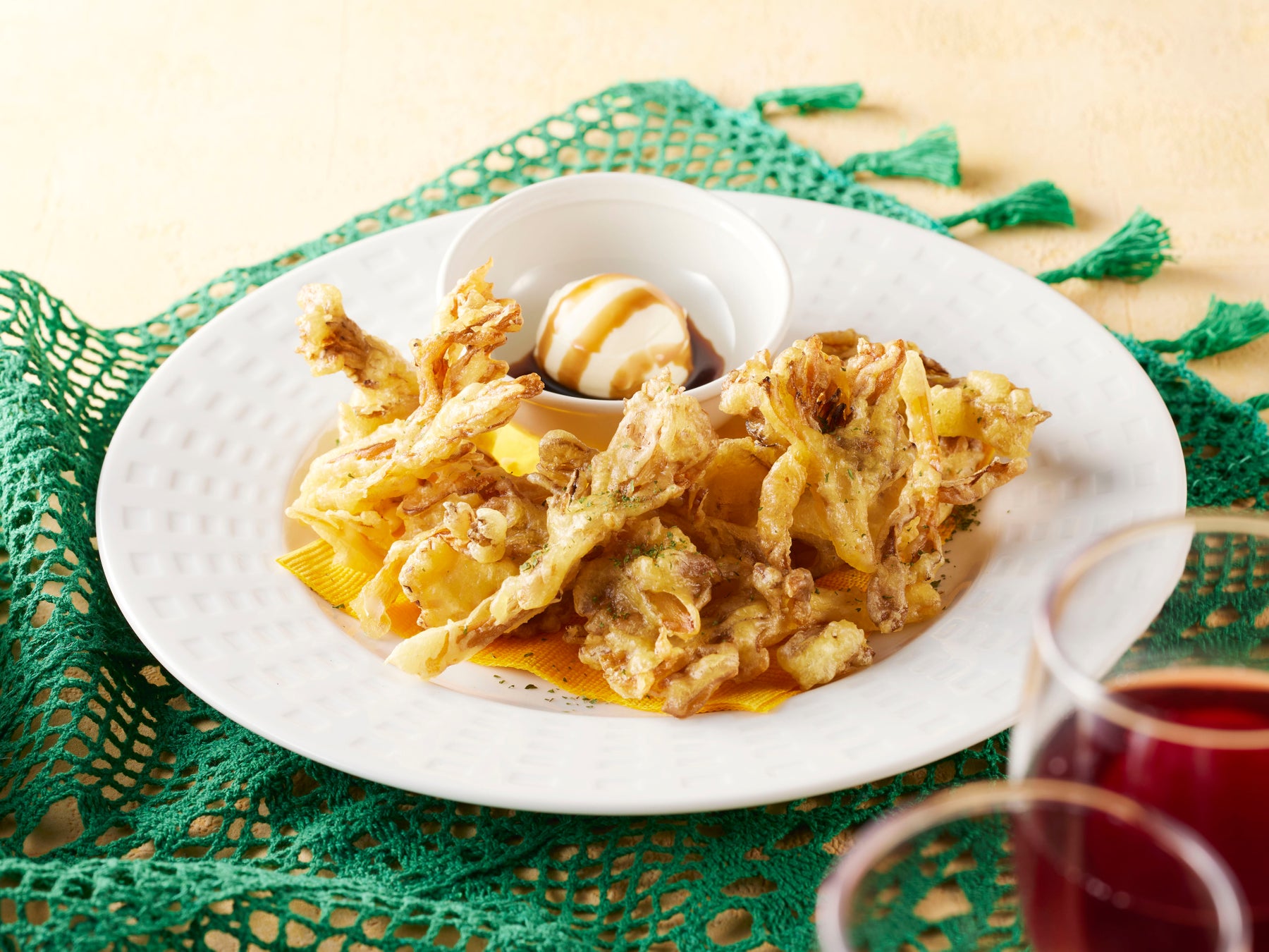 サクサクの軽い食感と舞茸のジューシーな味わいがやみつきになる一皿です。大きめに割いた舞茸は食べ応え抜群。爽やかな風味のサワークリームと上品な酸味のバルサミコソースで、ちょっぴり大人な味わいをご堪能ください。