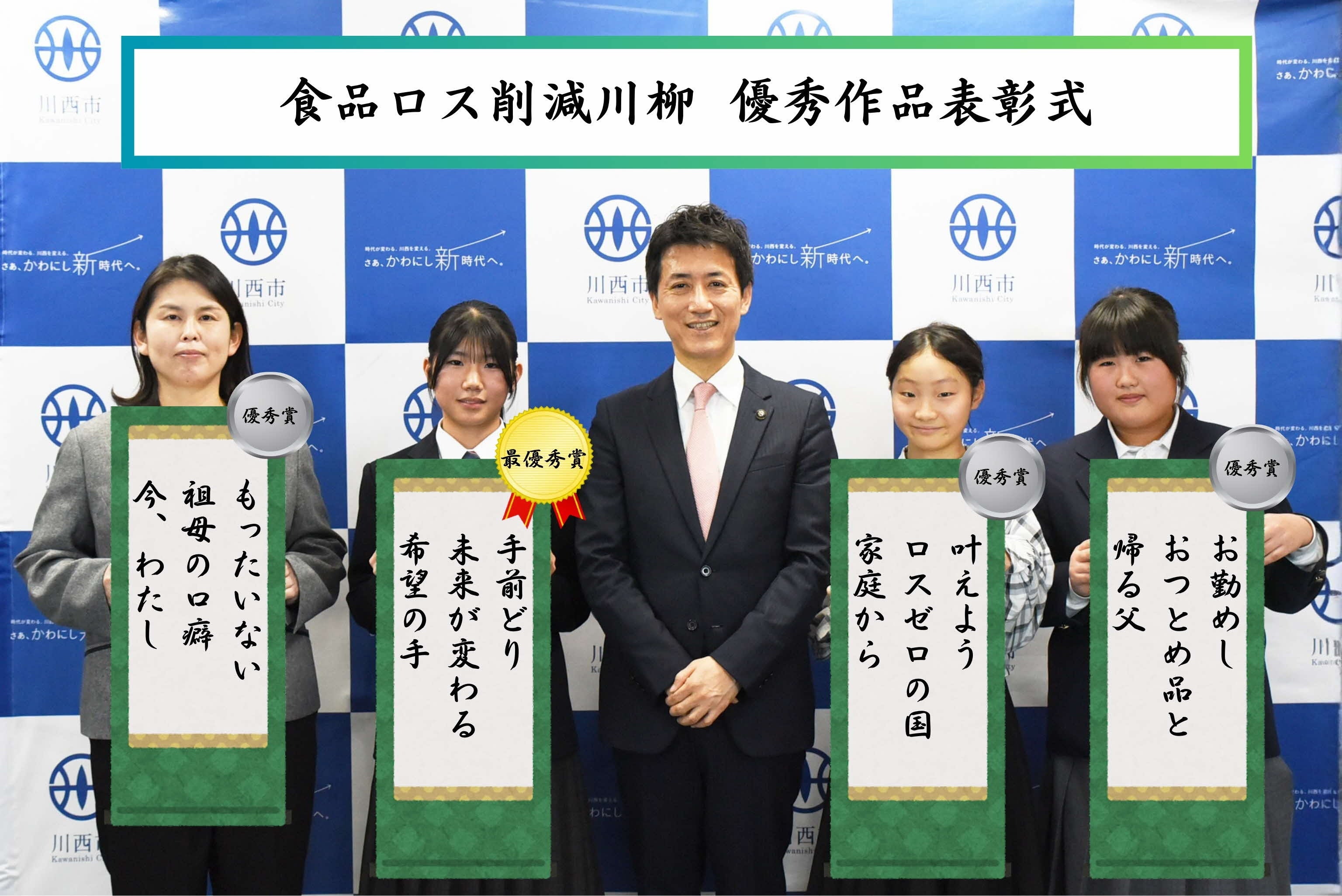 兵庫県川西市では、令和7年10月1日から令和7年12月5日までの期間で「食品ロス削減川柳」の募集を行いました。今年度は370名から807作品の応募があり、厳正なる審査の結果、最優秀賞1名と優秀賞4名などを決定し、1月30日に越田市長から表彰を行いました。