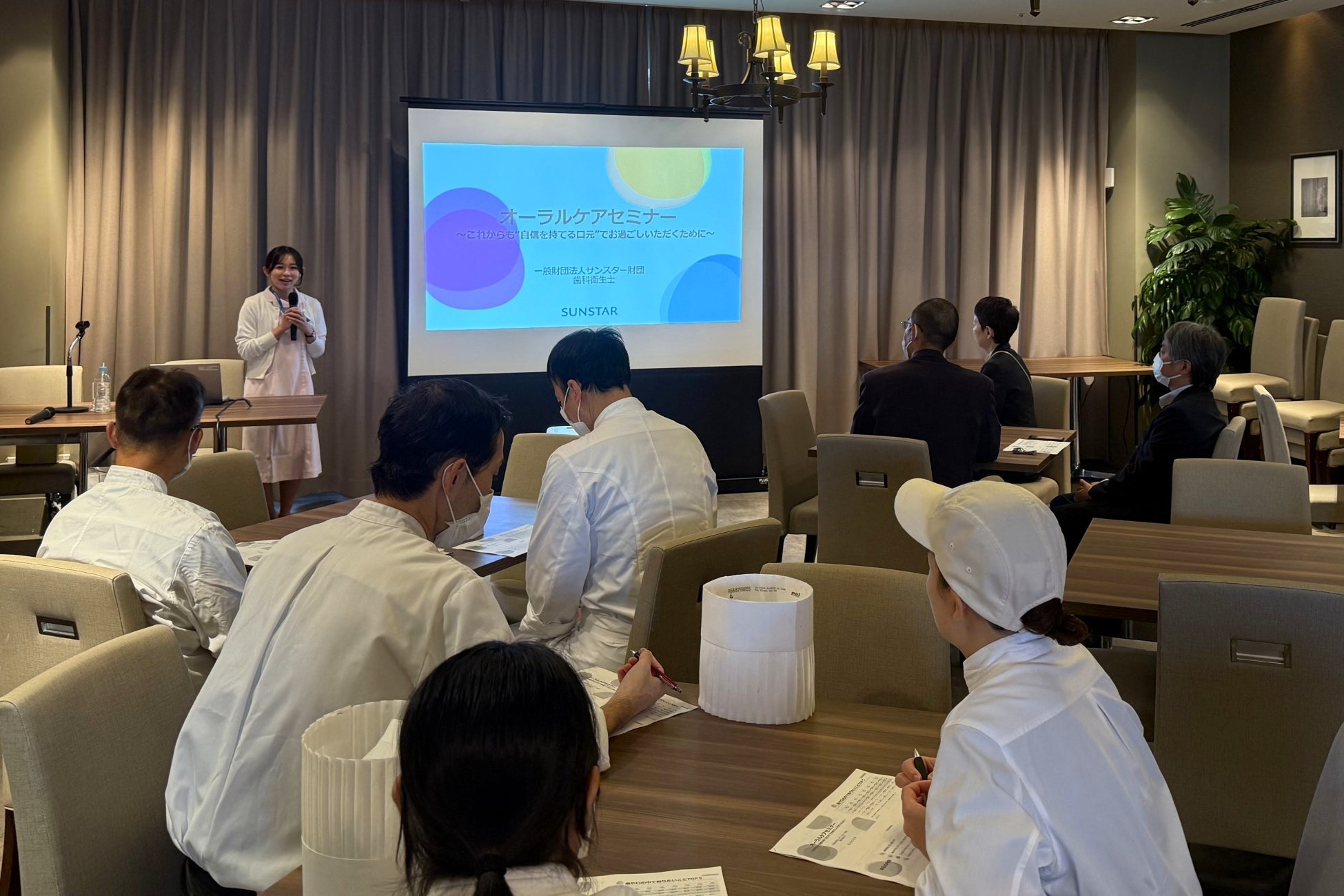 ゲストの皆さまに"最高の思い出と笑顔を届ける″ホテル ユニバーサル ポートとホテル ユニバーサル ポート ヴィータにて、ホテルクルーを対象としたオーラルケア社内研修プログラムを実施しました。2025年6月にはホテル ユニバーサル ポートのロビーにてゲスト向けにサンスターグループと共に歯の健康維持についての相談会を行っており、第2弾となる本研修においても、人生100 年時代、お口の健康を起点とした、全身の健康と豊かな人生「100年mouth 100年health」を掲げるサンスターグループに協力をいただきました。