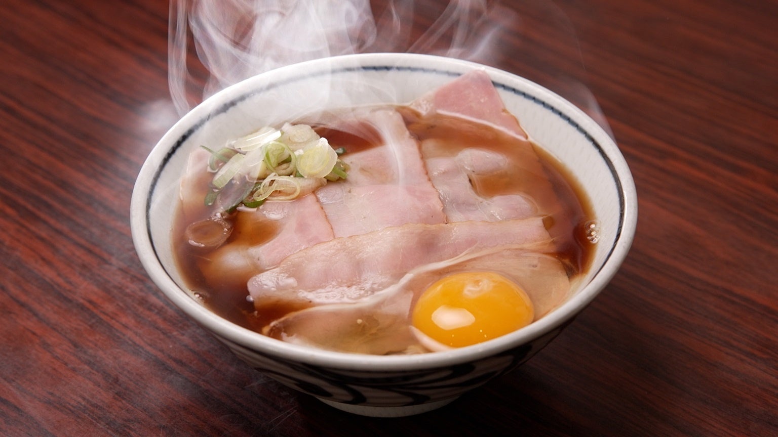 店主の一番のおススメは「ベーコンそば」で卵をトッピングして「ベーコンエッグそば」にすることで和と洋のマリアージュが楽しめる。
