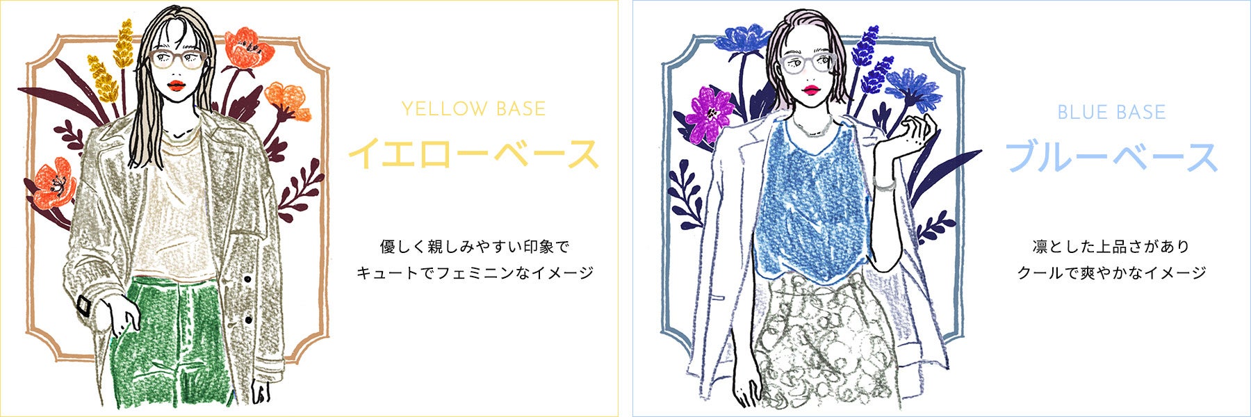 「パーソナルカラー(※1)」とは、持って生まれた肌の色や目の色、髪の毛の色などの個性と調和し、より魅力を引き出す色のことを言います。パーソナルカラーは大きく2つに分類され、優しく親しみやすい印象で、キュートでフェミニンなイメージの「イエローベース」と、凛とした上品さがあり、クールで爽やかなイメージの「ブルーベース」に分けられます。今回は、このパーソナルカラーに合わせてあなたに似合うフレームカラーをご提案いたします。