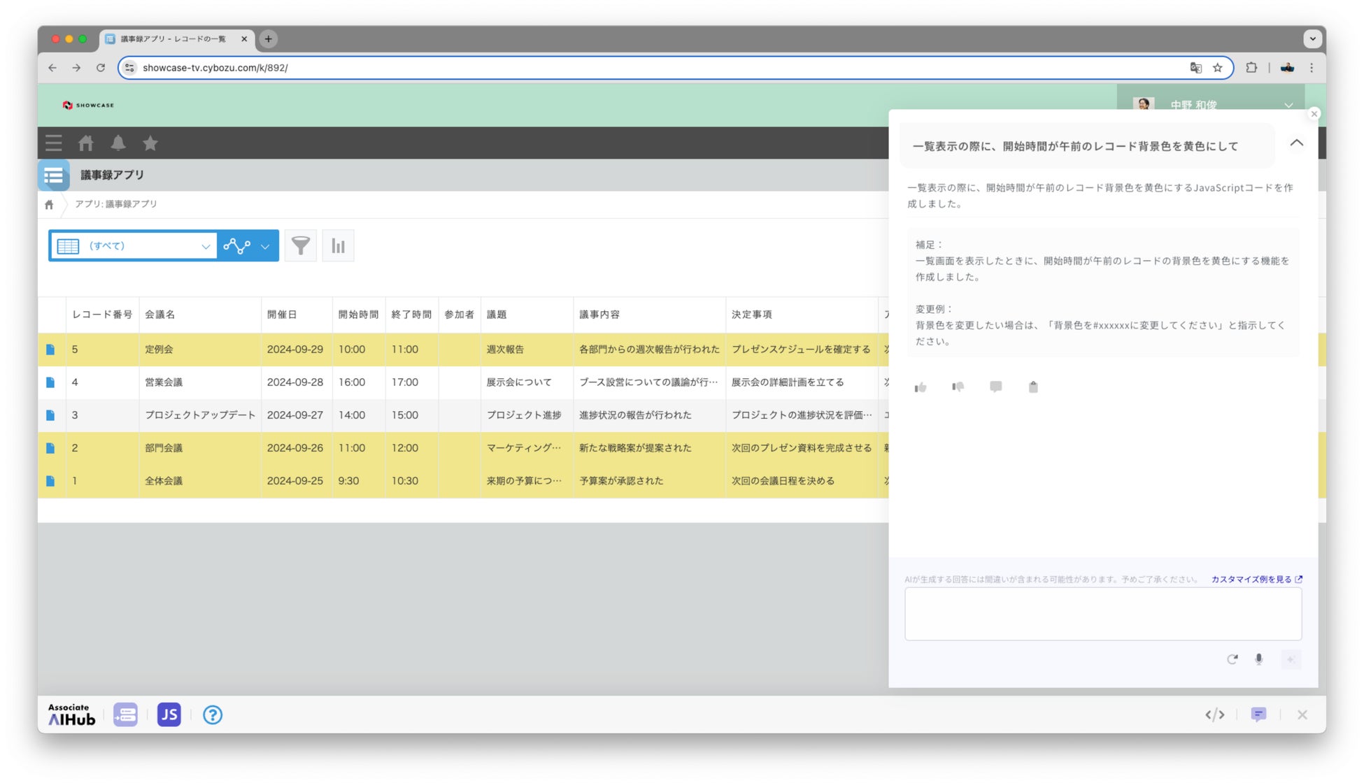 「Associate AI Hub for kintone」は、kintone内のアプリを作成したり、JavaScriptを活用した開発を可能にする、生成AIを活用したkintone専用のアシスタント機能です。