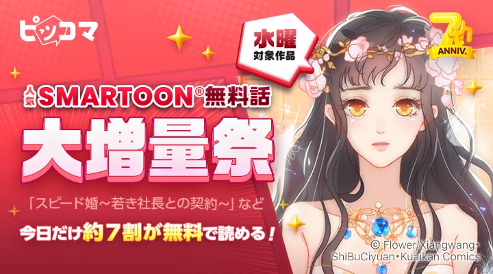 現在ピッコマでは、7年間を支えてくれた多くの方々への「感謝」をテーマに、アニバーサリーイベントを開催しております。5/3(水)〜5/9(火)は、“7周年”にちなみ、対象SMARTOON作品において、全配信話の約70%が無料公開される「人気SMARTOON無料話大増量祭」がスタート。対象作品は、曜日ごとに、毎日24時間限定で入れ替わります。