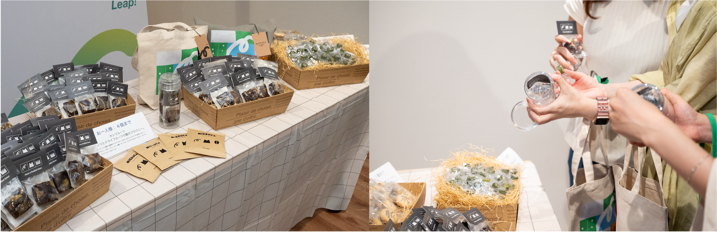 ユーザー同士がリラックスして会話できるアクティビティとして、ギフトとしてスイーツの詰め放題を提供。 スイーツは3種類6点を用意し、オリジナルのタグ、プリントなどを施しミエルカオリジナルスイーツとして見た目でも楽しんでいただける仕掛け。 スイーツを詰めるボトルとして中身が“ミエル”透明のボトルを提供。持ち帰った後は携帯用のドリンクボトルとしても活用可能です。