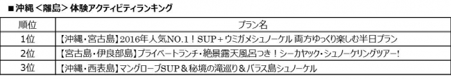 中でも宮古島は、平均滞在日数が3日間、4日間と比較的長期間であるため、流行のスタンドアップパドルボード(以下、SUP)や人気のシーカヤックといったアクティビティに加え、離島ならではの「ウミガメ」「秘境」といったテーマ性のあるシュノーケリングがセットになったプランを中心にご好評を頂いております。誰でも手軽に楽しめるシュノーケリングは、幅広い年齢層の方にご参加頂け、沖縄の透明度の高い海を自ら「体感」することができるため、夏のファミリー旅行でも例年人気となっております。