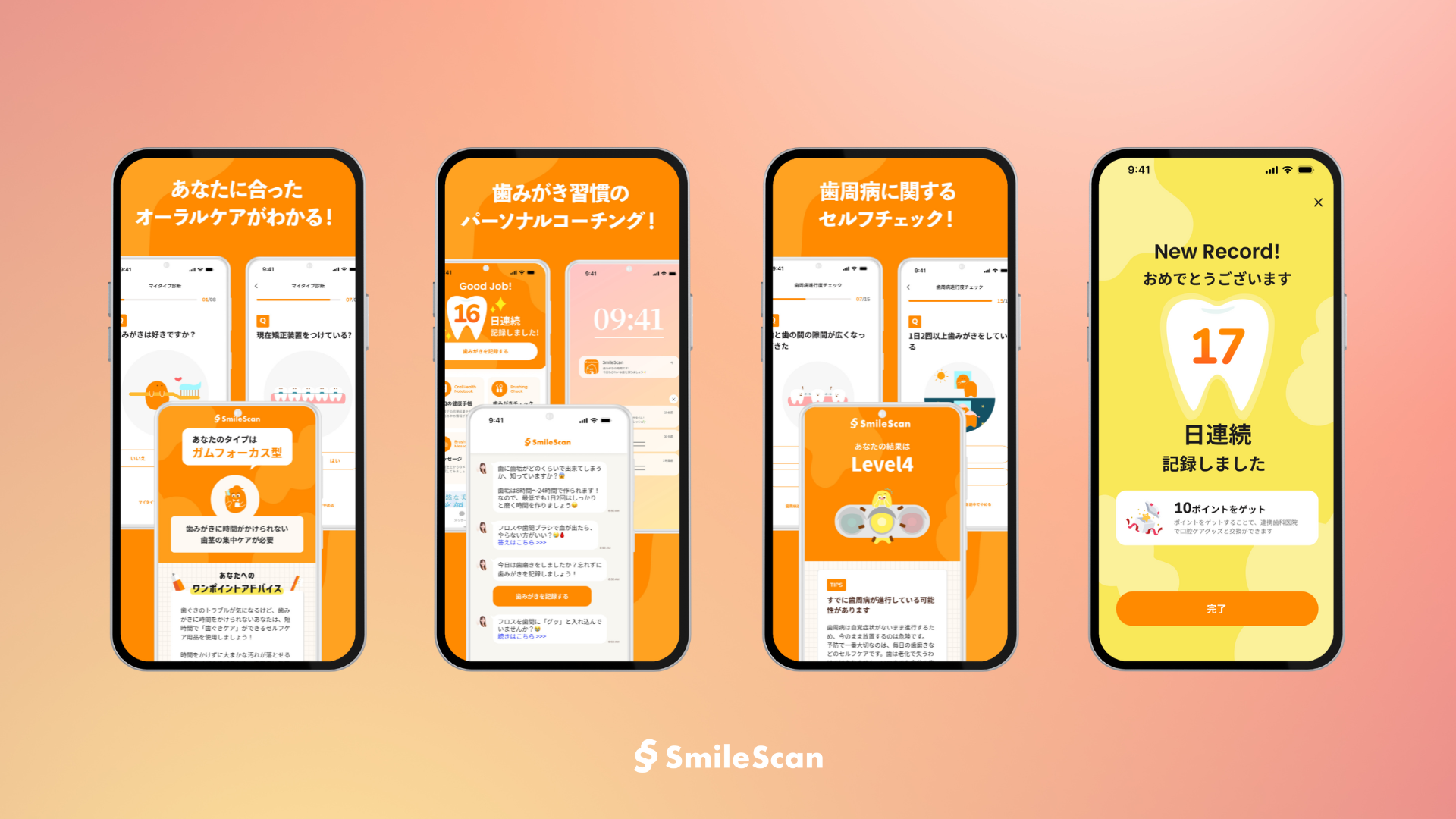 「SmileScan」アプリでは、より良いオーラルセルフケアを習慣化するため、歯科衛生士が伴走するプログラムをはじめ、利用者の継続的なオーラルケアをサポートするさまざまな機能が搭載されています。ハミガキ習慣や生活スタイルを分析し、最適なケアを提案する「マイタイプチェック」やオンライン設問による「歯周病セルフチェック」機能により、オーラルケアにおける利用者の現状を把握。そして、それぞれのお口の状態に応じたオーラルケアに関する動画やeラーニングにより、知識やノウハウを提供します。さらに正しいオーラルケアを継続しやすい仕掛けが組み込まれた3ヶ月間のセルフケア習慣化プログラム「スマイルケアコーチング」※4により習慣化を促します。