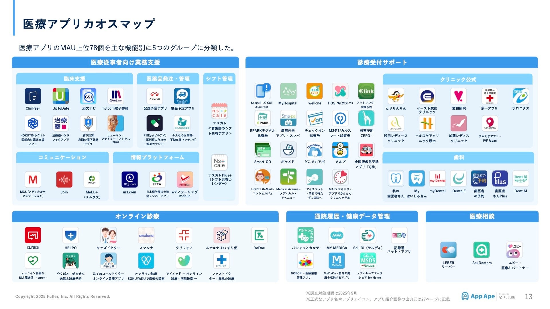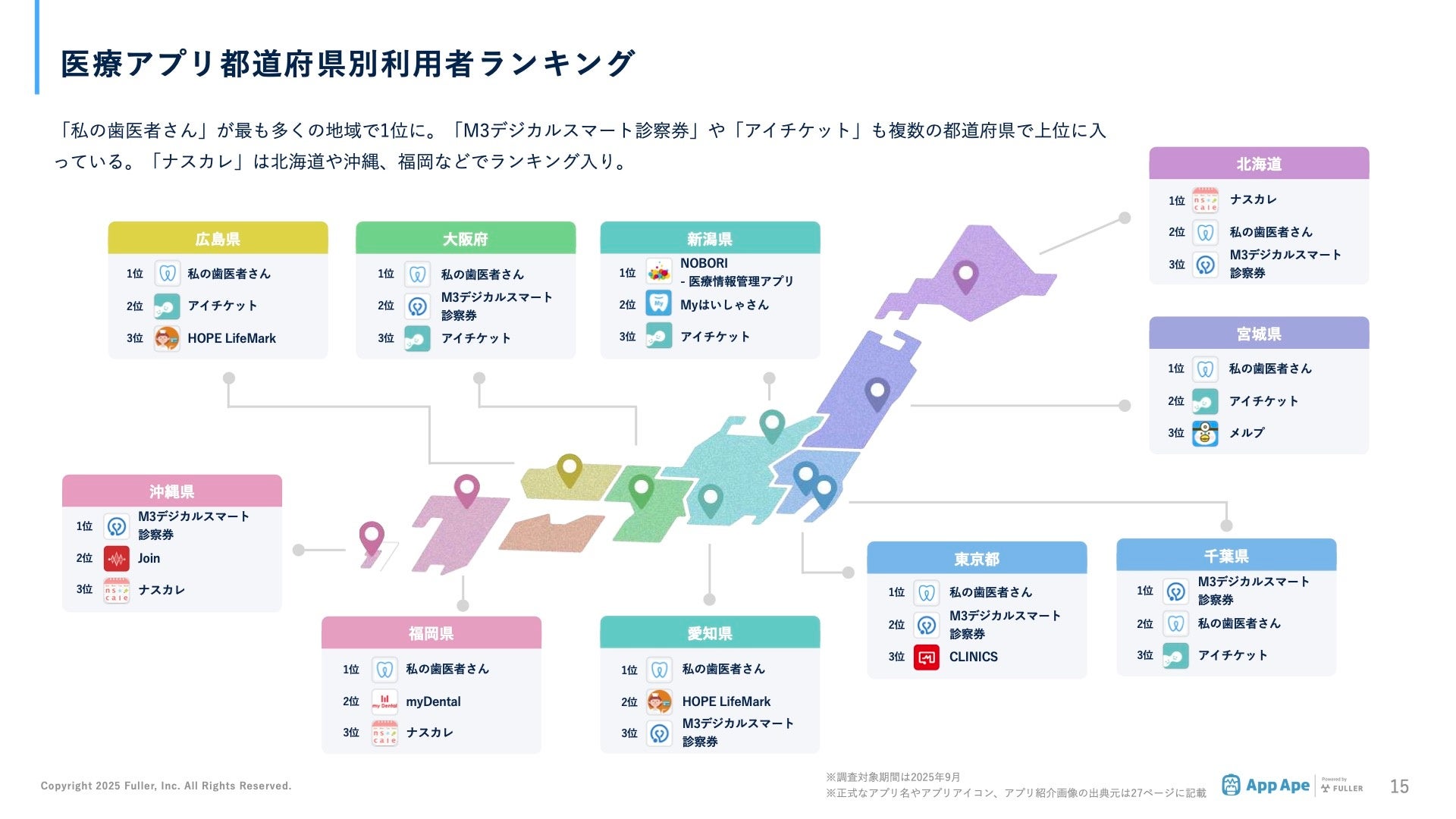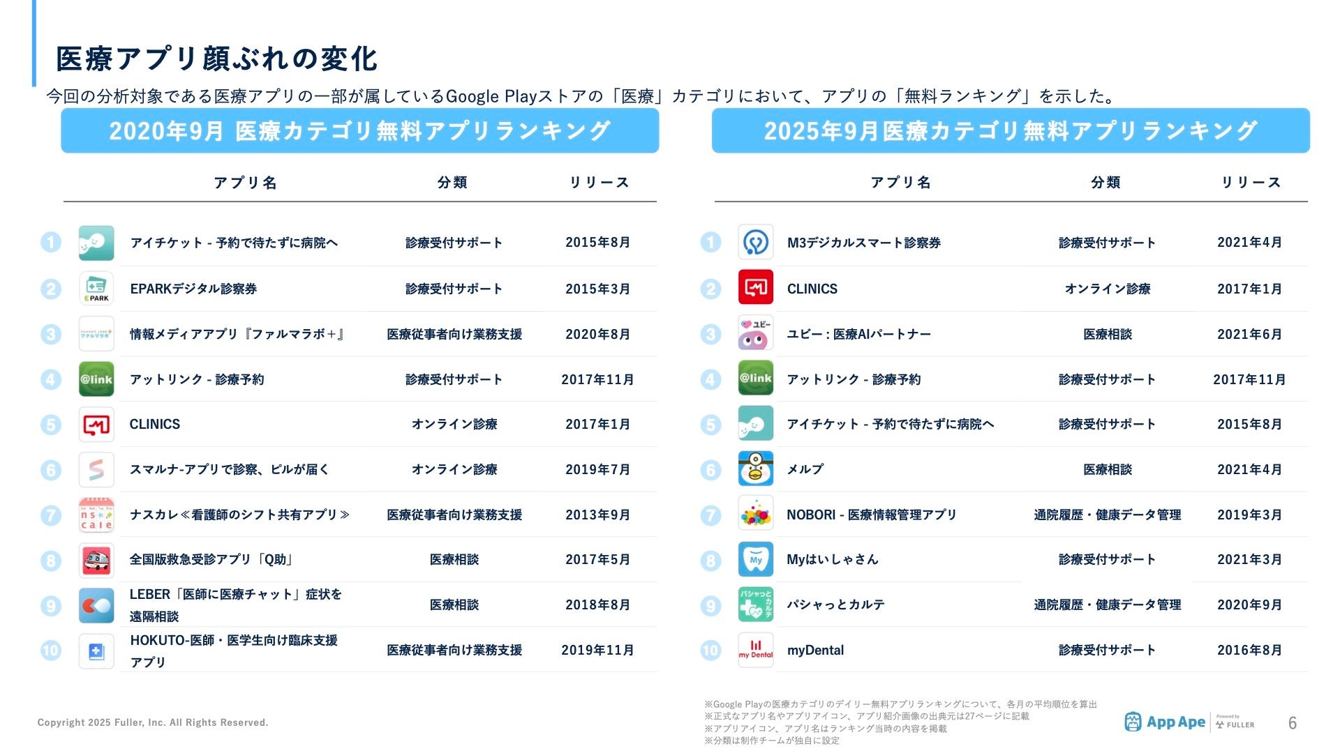 フラー株式会社(本社:新潟県新潟市、代表取締役社長:山﨑将司、以下「フラー」)は、アプリ市場分析サービス「App Ape(アップ・エイプ)」で蓄積するデータをもとに、医療アプリの動向や特徴をまとめた「医療アプリ市場調査レポート2025」を公開しました。