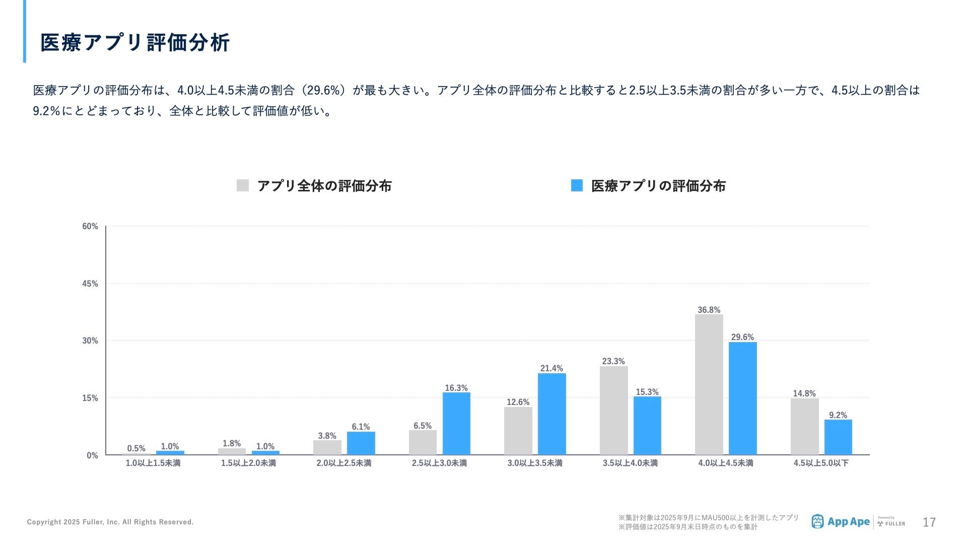 医療アプリの評価分布は、4.0以上4.5未満の割合(29.6%)が最も大きい傾向にあります。アプリ全体の評価分布と比較すると2.5以上3.5未満の割合が多い一方で、4.5以上の割合は 9.2%にとどまっており、全体と比較して評価値が低いことが分かります。