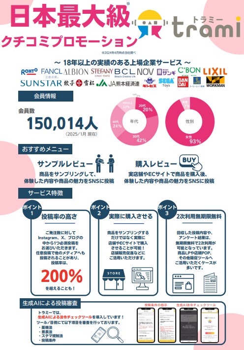 トラミーは、クライアントの商品やサービスをトラミー会員が体験し、体験した会員自身が利用するSNS上でクチコミ・レビューを公開(情報発信)するクチコミプロモーションサービスです。 20~40代の一般女性を中心とした約15万人*¹の会員を保有しております。一連の業務をすべて当社がディレクションすることで品質を確保し、クライアントへ提供しております。