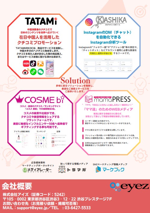 2007年に設立された独自サービスを複数展開するマーケティング会社です。クチコミマーケティング「トラミー」や国内No.1*³の広告業界のプラットフォーム「メディアレーダー」などを運営しています。2022年、テクノロジー企業成長率ランキング 「Technology Fast 50 2022 Japan」を受賞。2022年12月21日、東証グロース上場。(証券コード:5242)