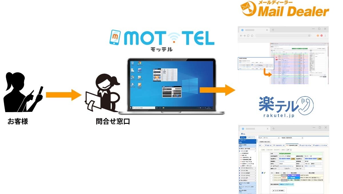 MOT/TELに付属するパソコン電話(ソフトフォン)への着信時にMailDealerや楽テルに登録された顧客情報を自動でブラウザに表示。MOT/TELとの連携により、着信した電話番号から即座に発信者の情報、過去のメール・電話対応履歴を参照することができるようになります。