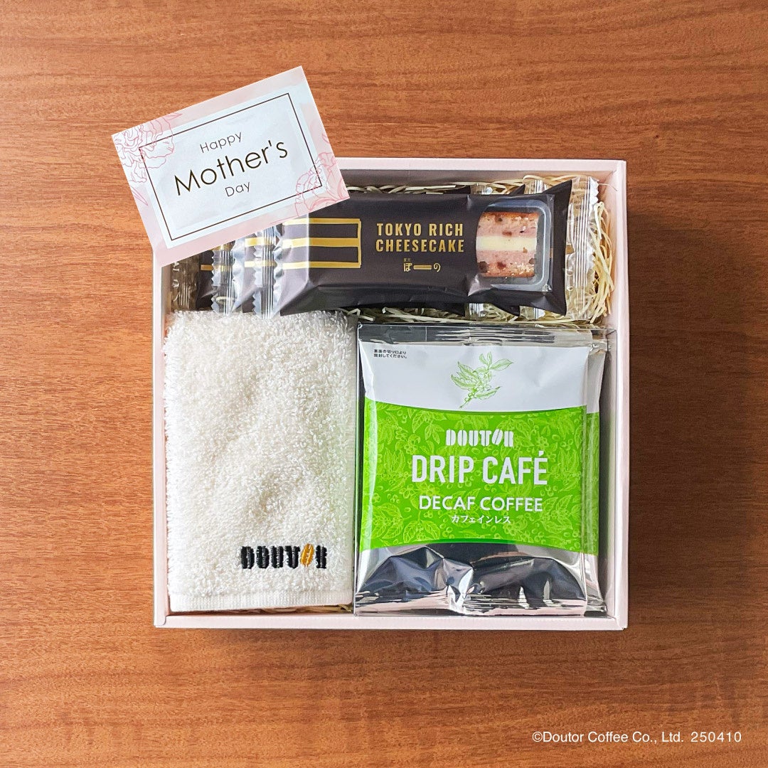 ドトールコーヒーショップの一番人気「マイルドブレンド」のドリップカフェと、「東京ぼーの」の甘く香り立ついちごとまろやかなチーズの相性が抜群の「トーキョーリッチストロベリーチーズケーキ」、母の日に贈りたいドトールコーヒーオリジナルの「プリザーブドフラワー」または「ハンドタオル」をセットにしたオンラインショップ限定の「母の日ギフトセット」です。カフェインを気にされている方には、ドリップカフェを「カフェインレスコーヒー」に変更することもできます。お母様の好みに合わせて、選べるギフトをご用意いたしました。