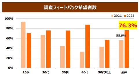 本調査では、調査結果を監修医師が分析し、回答者へ診断結果をフィードバックしています。今回もフィードバック希望有無をヒアリングした結果、「必要」と回答した人が2021年は「55.9%」、2023年は「76.3%」となり、2021年と比べて約18%の増加といった結果になりました。全体の約8割がフィードバックを希望しており、健康課題を自分ごと化して考えることができる従業員が増えていることが分かりました。また、従業員に向けてのフィードバックを続けることで、さらなるパフォーマンスとリテラシーの向上も期待されます。
