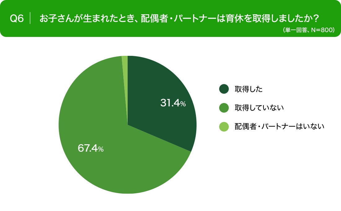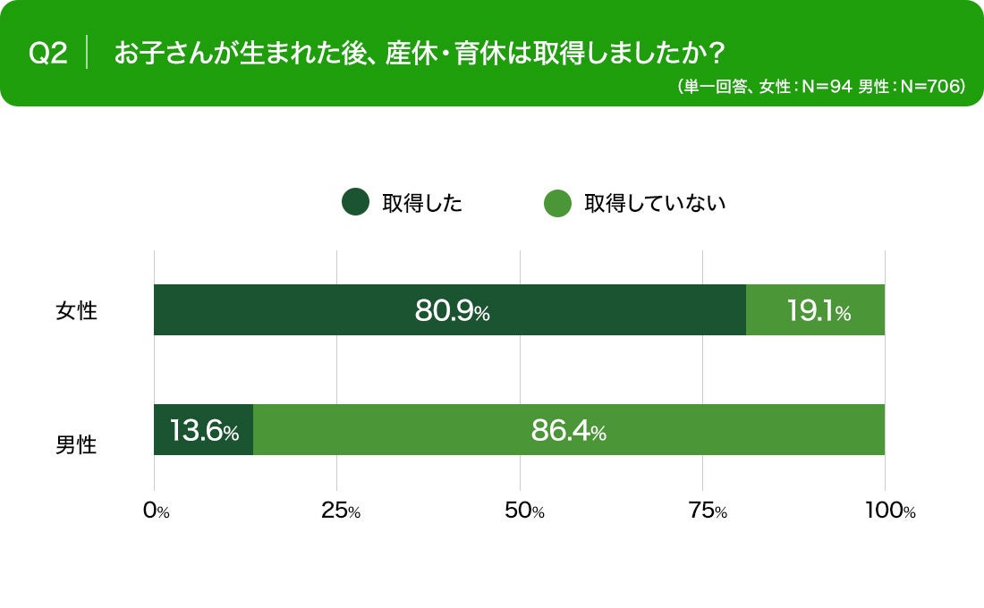 さらに、お子さんがいる方に、「お子さんが生まれる際、生まれた後に産休※1・育休※2を取得したか」を調査しました。その結果、男女で大きな差「取得した(女性:80.9%、男性:13.6%)」がありましたが、年代で比較すると男性の50代以上では6.6%だった「取得した」の割合が、40代以下では23.3%となり、男性の育休取得は増えていることがわかりました。