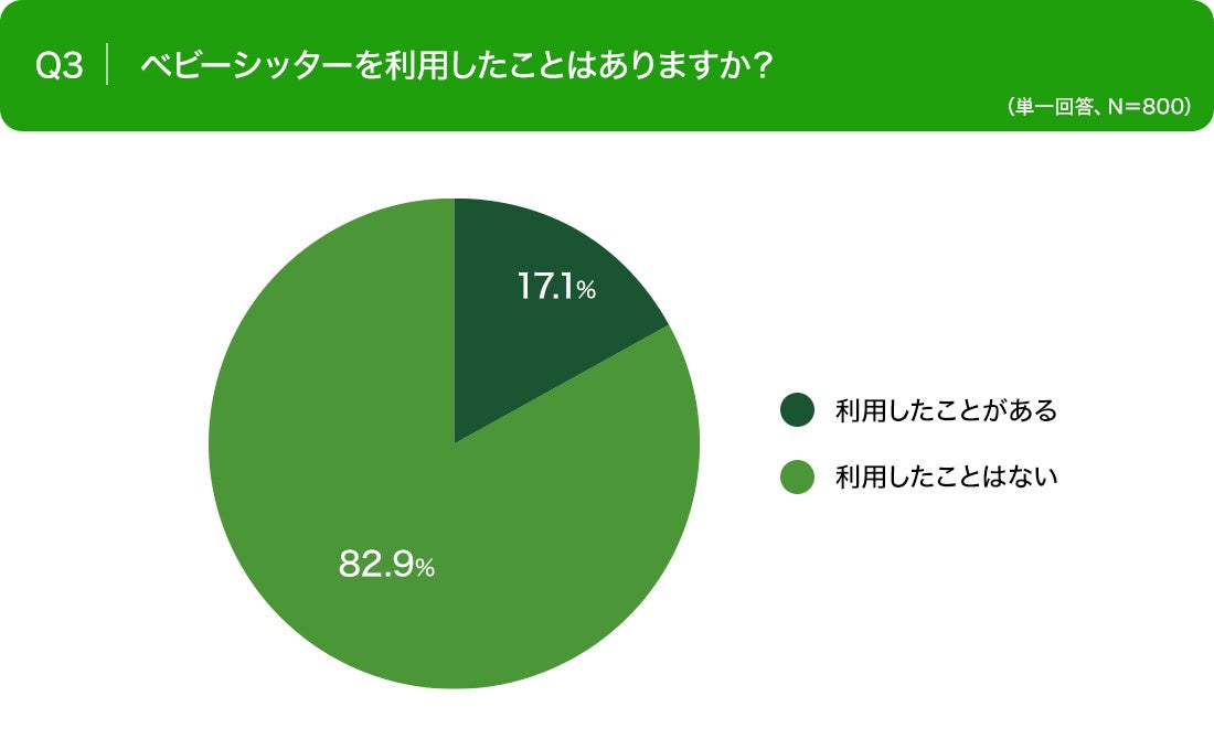 さらに、忙しい医師はベビーシッターなど、外部の子育て支援サービスを使う人が多いのか「ベビーシッターの利用率」について調査を行いました。その結果、「利用したことはない(82.9%)」と8割超が答え、「利用したことがある(17.1%)」は少数派ということがわかりました。