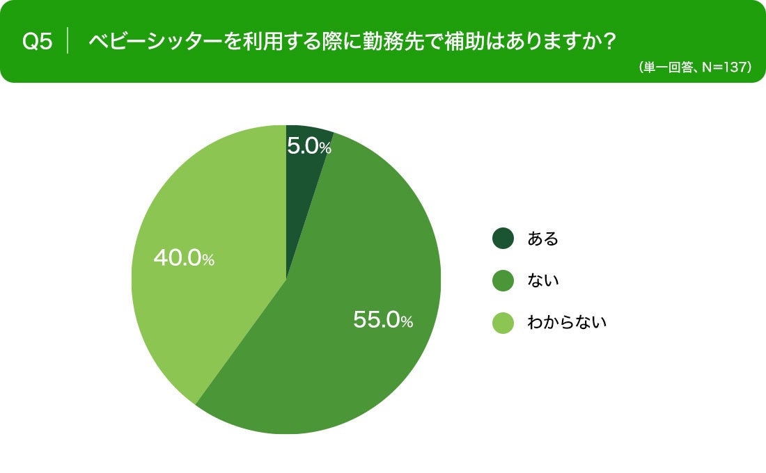 職場でベビーシッターの利用について補助があるかについては、「補助はない(55.0%)」が過半数でしたが、「わからない(40.0%)」も多く、ベビーシッターの補助制度などを知らない方も多いことが伺える結果となりました。