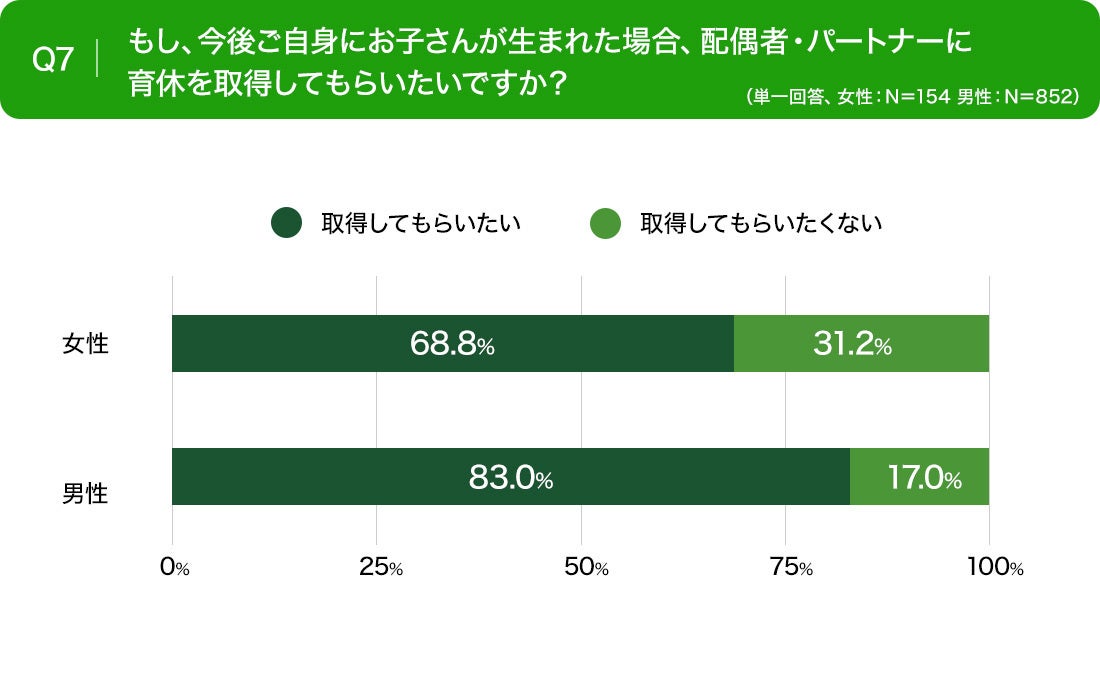 今後、お子さんが生まれた際、パートナーに育休を取得してもらいたいかについて調査しました。その結果、「取得してもらいたい」と女性は約7割(68.8%)、男性については8割以上(83.0%)が回答しました。合算すると「取得してもらいたい(80.8%)」と約8割が取得を希望する結果となっています。