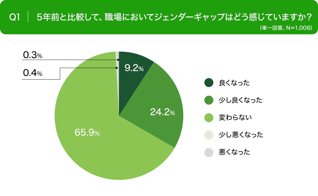 職場のジェンダーギャップ5年前から「変わらない」が7割弱、しかし「よくなった」という回答も約3割に