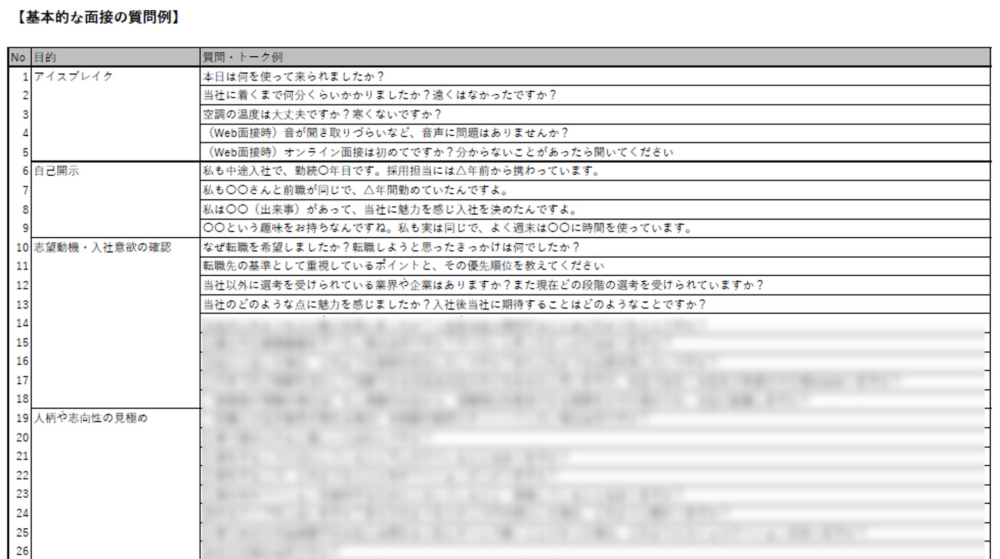 ・面接の目的別の人事担当者向け質問例(アイスブレイク、自己開示、志望動機の確認、人柄の見極め、能力の見極め、退職理由や本音の把握等)