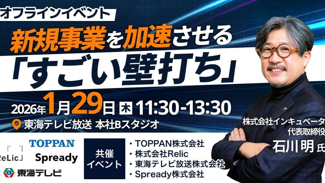 本イベントは、ベストセラー『すごい壁打ち』の著者・株式会社インキュベータ代表 石川明氏を招き、Spready、東海テレビ、TOPPAN、Relicの4社から新規事業の最前線で活躍するプロフェッショナルが登壇。