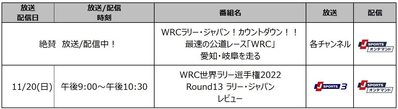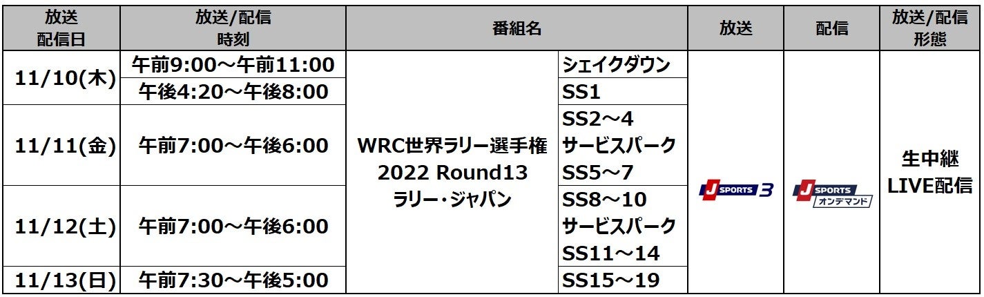 国内最大4チャンネルのスポーツテレビ局、株式会社ジェイ・スポーツ(本社 東京都江東区、代表取締役社長 長谷一郎、以下「J SPORTS」 ※1)は、11月10日(木)より11月13日(日)まで愛知・岐阜両県で開催されるFIA世界ラリー選手権(以下WRC)の第13戦「ラリー・ジャパン」の全てのスペシャルステージ(SS)を生中継いたします。またPC、スマホ、タブレットで見られる 「J SPORTSオンデマンド 」 ※2でも、放送同様にLIVE配信いたします。