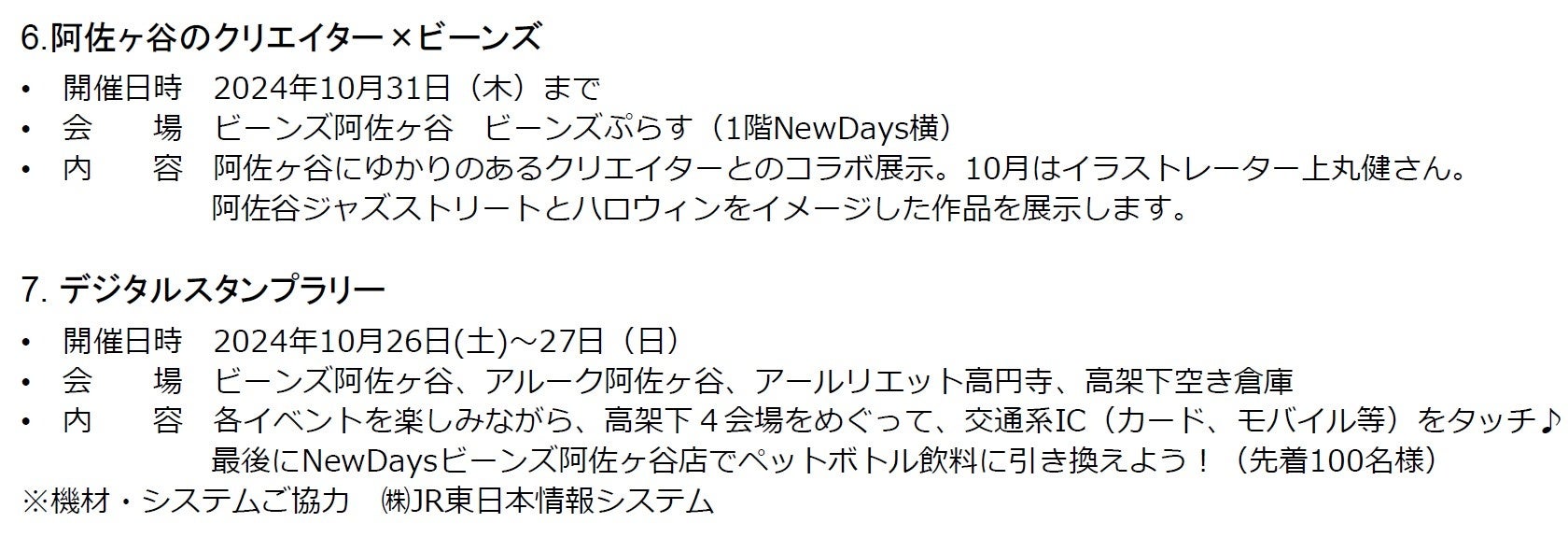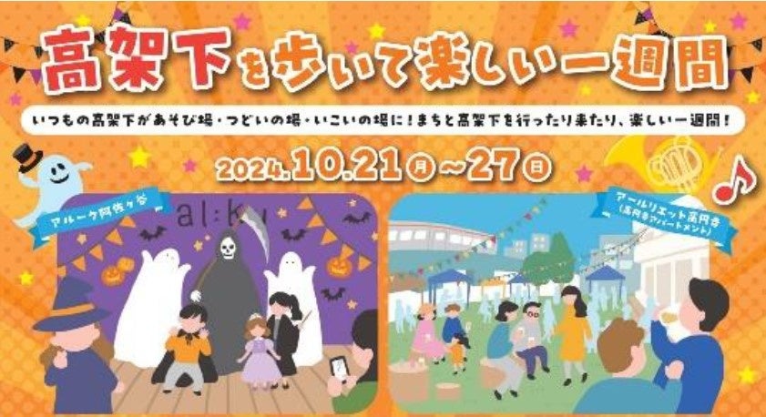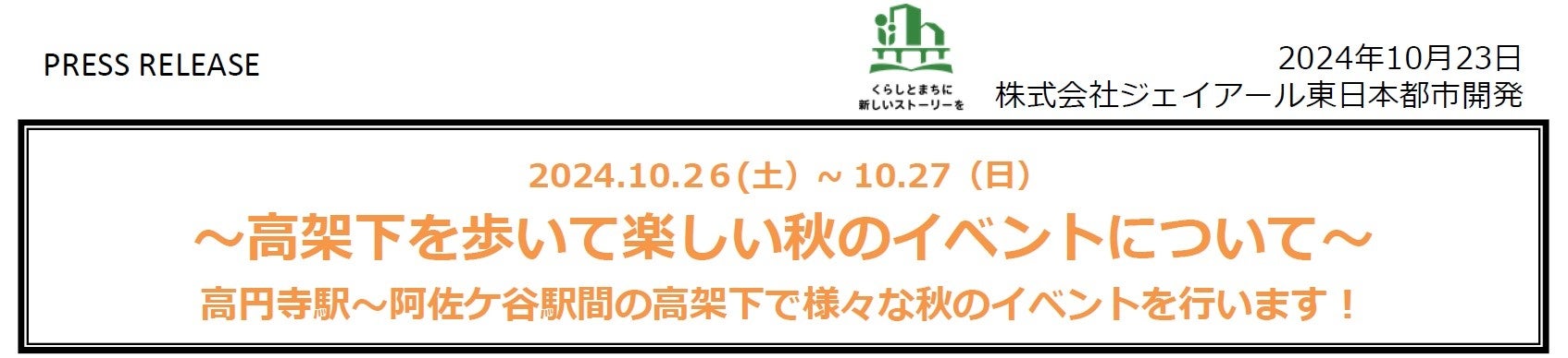 ジェイアール東日本都市開発では、阿佐ヶ谷・高円寺エリアの方に「歩きたくなる高架下」と感じていただけることを目指し、「阿佐ヶ⾕・高円寺プロジェクト」という活動を続けています。このたび、2024年10月26日(月)~ 10月27日(日)に「高架下を歩いて楽しい秋のイベント」と題しまして、期間中さまざまなイベントを高円寺駅~阿佐ケ谷駅間の各施設において開催いたします。