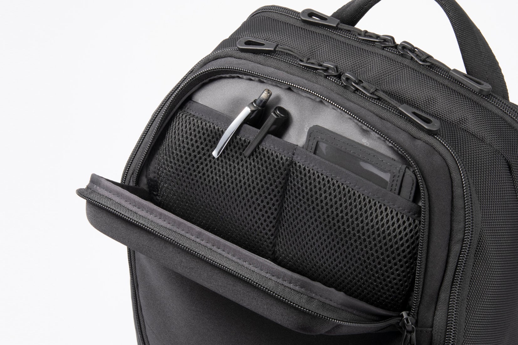ええーす 中身を保護する「EVA 成形フロントポケット」は、移動中も荷物を出し入れしやすい「縦開き仕様」。