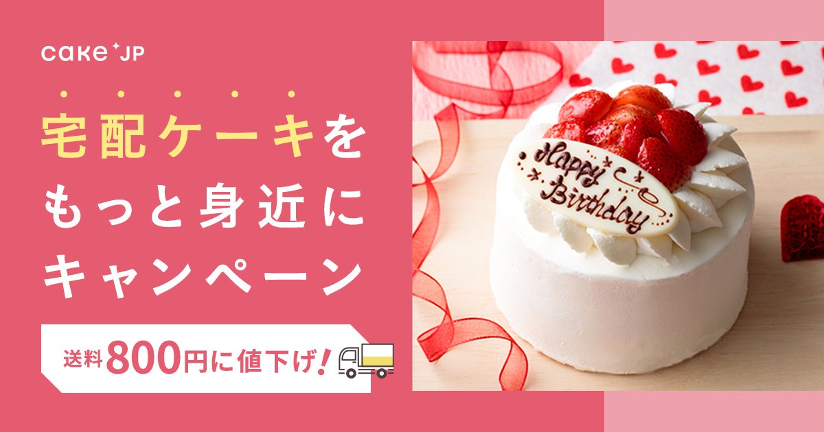 そこで、もっと気軽にご利用いただけるよう、これまで1,100円(税込)であった送料を800円(税込)に値下げする『宅配ケーキをもっと身近にキャンペーン』を実施することといたしました。ケーキ・スイーツの宅配が気になっていたけどご利用まで至らなかった方へはもちろんのこと、Cake.jpをご愛用いただいているお客様にも商品をお届けできるきっかけになればと願っております。
