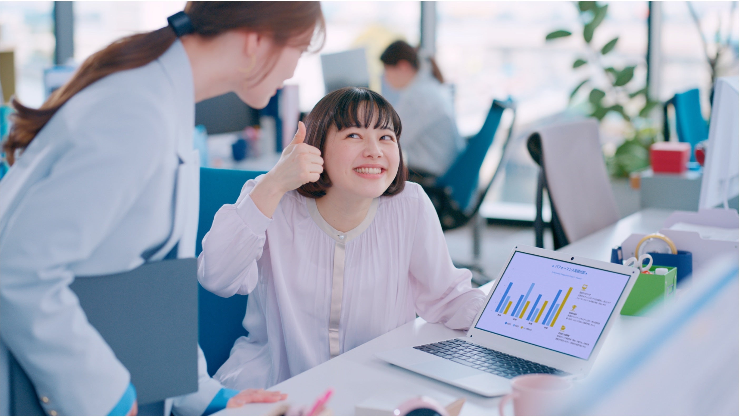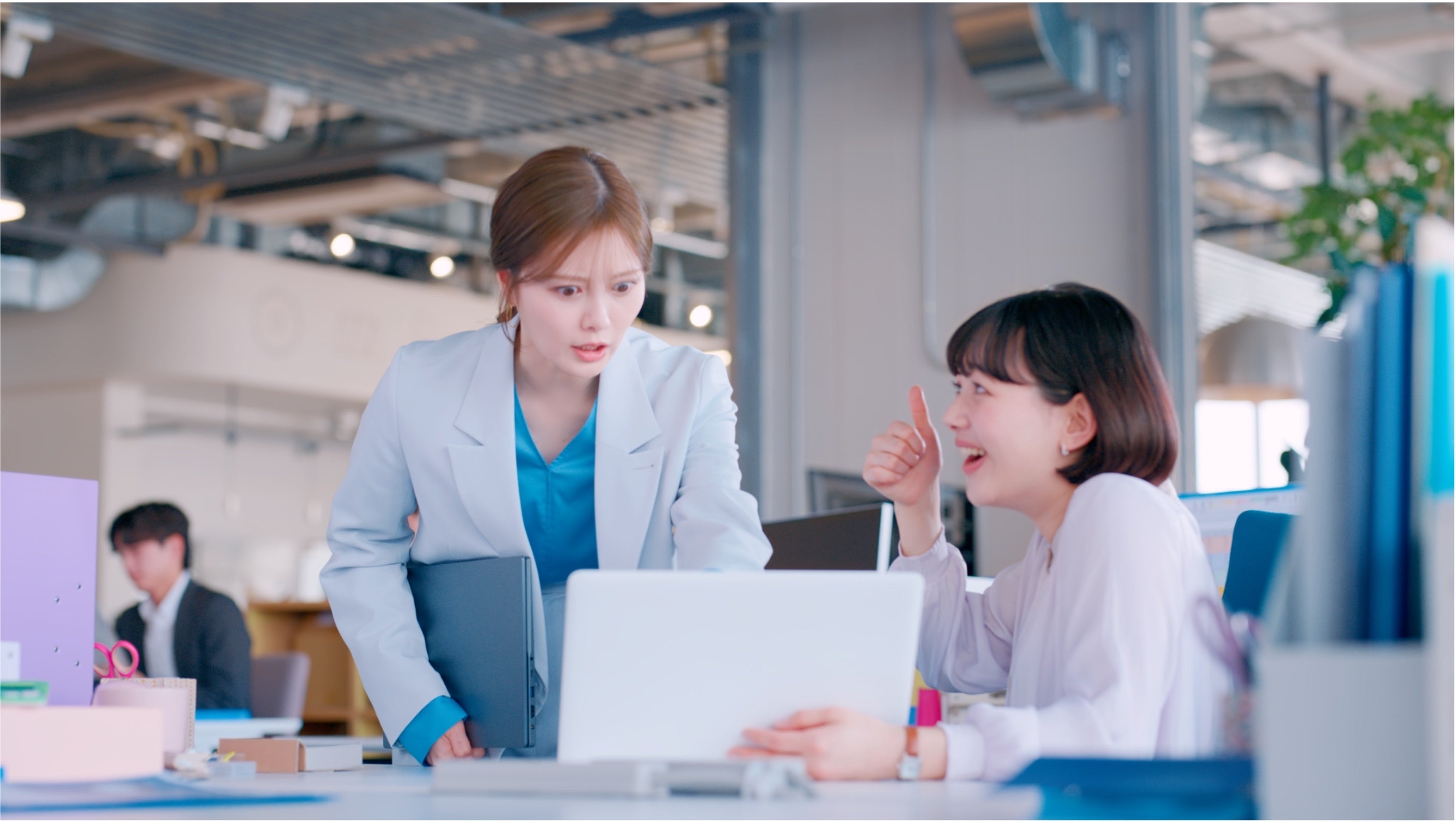 ミーティング直前のオフィスでのワンシーン。資料作りをお願いされていた後輩社員はその出来映えに自信ありげな様子。ところが!パソコンを覗き込んだ白石先輩は資料のミスに気付き青ざめます。