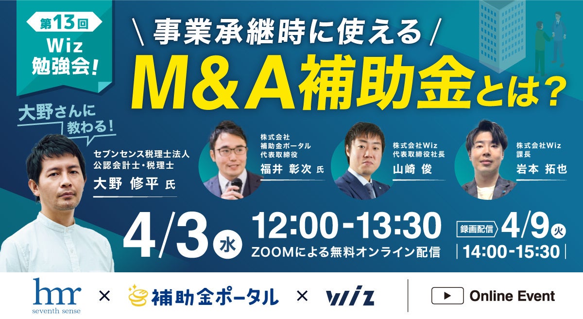 《4/3(水) 補助金と融資のプロ・大野さんに教わる!》事業承継時に使える【M&A補助金】の勉強会!