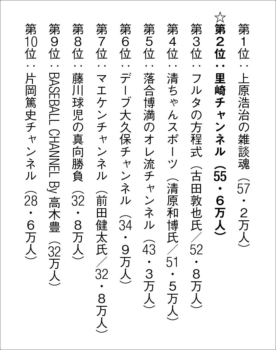 「上原浩治の雑談魂(57.2万人)」に続き、チャンネル登録者数55.6万人(2022年11月11日現在)で第2位となっている。